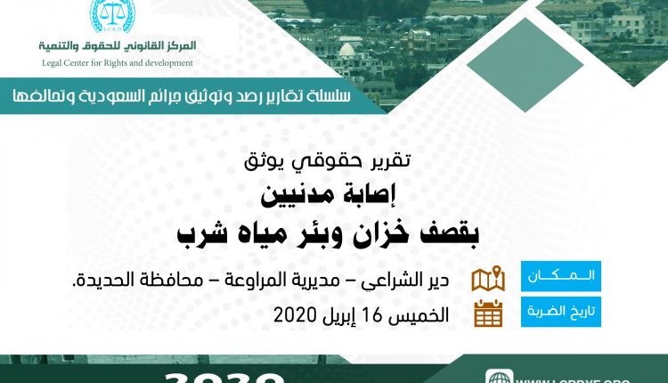 شن طيران تحالف العدوان السعودي غارة جوية عند الساعة الـ 5:00 فجر يوم الخميس الموافق 16 ابريل 2020م ، استهدفت خزان وبئر مياه شرب بمزرعة المواطن مالك العزاني الكائنة بمنطقة دير الشراعي – مديرية المراوعة – محافظة الحديدة، مما أسفرت عن تدمير خزان مياه الشرب الذي يغذي سكان المنطقة بماء الشرب النقي والحقت أضراراً ببئر المياه ومنزل المواطن/ سلمان حمود عامر، وإصابة (3) مدنيين من أسرة سلمان عامر هم زوجته فاطمة محمد حسن تبلغ من العمر (45) عاماً ، وابنائهما الطفلة براءة سلمان عامر (14) عاماً، حمود سلمان عامر يبلغ من العمر 20 عاماً، كما أسفرت الغارة إلى نفوق عدد من الماعز التابع للأسرة المنكوبة .