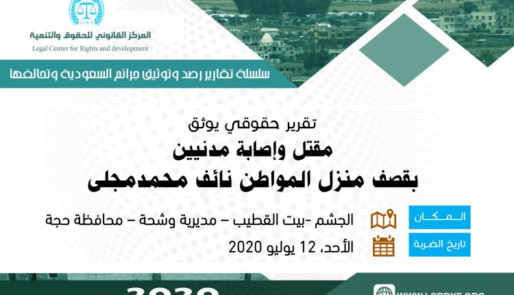مقتل وإصابة مدنيين بقصف منزل المواطن نائف محمد مجلي – بقرية الجشم – بيت القطيب – مديرية وشحة – محافظة حجة الأحد، 12 يوليو 2020