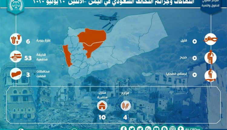 إحصائية أولية لإنتهاكات التحالف السعودي في اليمن – الإثنين 20 يوليو 2020 Last updated نوفمبر 28, 2020 للتحميل التحالف السعوديالضحايا المدنيين في اليمنالمركز القانوني للحقوق والتنميةاليمنرصد وتوثيق انتهاكات التحالف السعودي Share FacebookTwitterGoogle+ReddItWhatsAppPinterestالبريد الإلكتروني