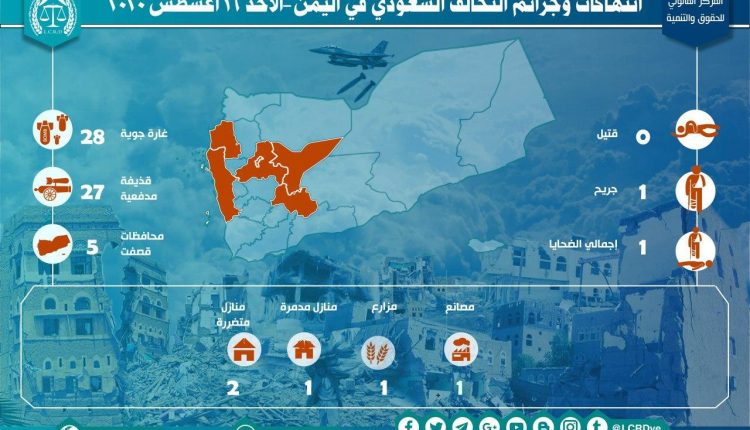 إحصائية أولية لإنتهاكات التحالف السعودي في اليمن – الأحد 16 اغسطس 2020 Last updated نوفمبر 29, 2020 للتحميل الضحايا المدنيين في اليمنالمركز القانوني للحقوق والتنميةاليمنرصد وتوثيق انتهاكات التحالف السعوديغارات التحالف السعودي على اليمن Share FacebookTwitterGoogle+ReddItWhatsAppPinterestالبريد الإلكتروني