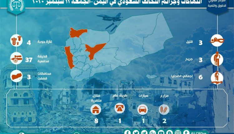 إحصائية أولية لإنتهاكات التحالف السعودي في اليمن – الجمعة 11 سبتمبر 2020 Last updated نوفمبر 30, 2020 للتحميل التحالف السعوديالمركز القانوني للحقوق والتنميةاليمنرصد وتوثيق انتهاكات التحالف السعودي Share FacebookTwitterGoogle+ReddItWhatsAppPinterestالبريد الإلكتروني