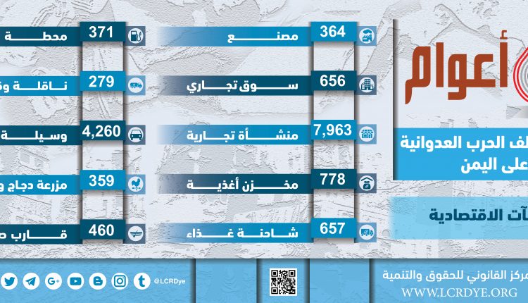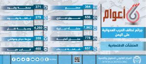 احصائيات المنشآت الاقتصادية نتيجة الغارات التي تشنها قوات التحالف السعودي خلال 6 أعوام منذ بداية العدوان على اليمن On مارس 28, 2021 Share FacebookTwitterGoogle+ReddItWhatsAppPinterestالبريد الإلكتروني