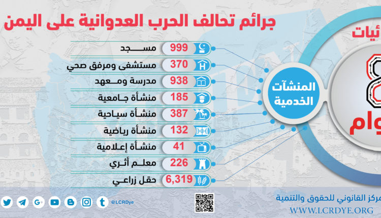 احصائيات المنشآت الخدمية نتيجة الغارات التي تشنها قوات التحالف السعودي خلال 8 أعوام منذ بداية العدوان على اليمن On مايو 28, 2023 Share FacebookTwitterGoogle+ReddItWhatsAppPinterestالبريد الإلكتروني