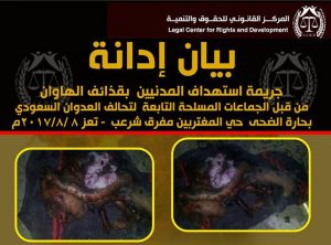 #بيان_إدانة | جريمة استهداف المدنيين بقذائف الهاوان من قبل الجماعات المسلحة التابعة لتحالف العدوان السعودي – بحارة الضحى حي المغتربين مفرق شرعب – تعز 8/8 /2017