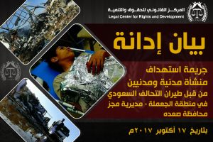 المركز القانوني للحقوق والتنمية اذ يدين ويستنكر هذه الجريمة البشعة بحق الانسانية فانه يحمل السعودية وتحالفها المسئولية عن الجريمة وسابقاتها ويطالب بالتحقيق والمسائلة الجنائية لقيادات التحالف وجميع من يثبت تورطهم في هذه الجرائم , كما يحمل منظمة الأمم المتحدة ومجلس الأمن مسؤولية صمتها المخزي وتنصلها عن واجباتها مما شجع السعودية وتحالفها في ارتكاب المزيد من جرائم الحرب بحق الشعب اليمني وبصورة اكثر وحشية .