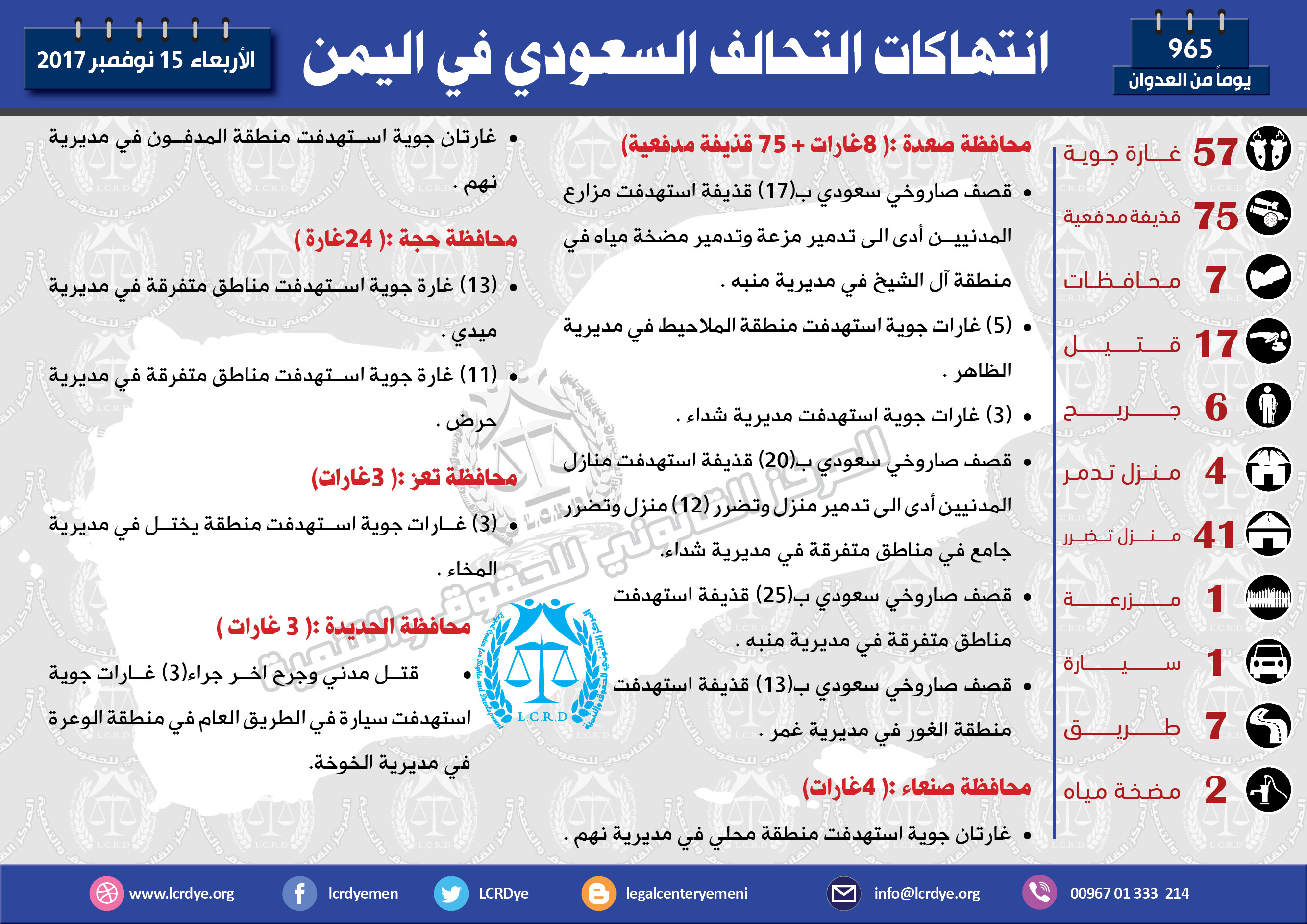 انتهاكات السعودية وتحالفها في اليمن 15 نوفمبر 2017 Last updated نوفمبر 21, 2017 لتحميل التقرير برابط مباشر: استهداف المدنييناستهداف المنشآت الاقتصاديةاستهداف المنشآت المدنيةالمركز القانوني للحقوق والتنميةانتهاك القانون الدوليجرائم التحالف السعوديرصد وتوثيق انتهاكات التحالف السعوديغارات التحالف السعودي على اليمن Share FacebookTwitterGoogle+ReddItWhatsAppPinterestالبريد الإلكتروني