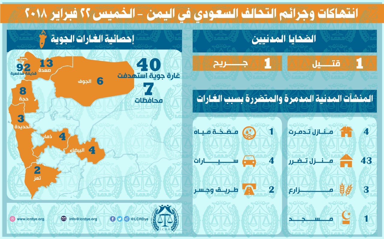 انتهاكات التحالف السعودي في اليمن 22 فبراير 2018 Last updated فبراير 24, 2018 للتحميل https://www.lcrdye.org/wp-content/uploads/2018/02/22-2-2018-1.pdf التحالف السعوديالمركز القانوني للحقوق والتنميةاليمنرصد وتوثيق انتهاكات التحالف السعودي Share FacebookTwitterGoogle+ReddItWhatsAppPinterestالبريد الإلكتروني