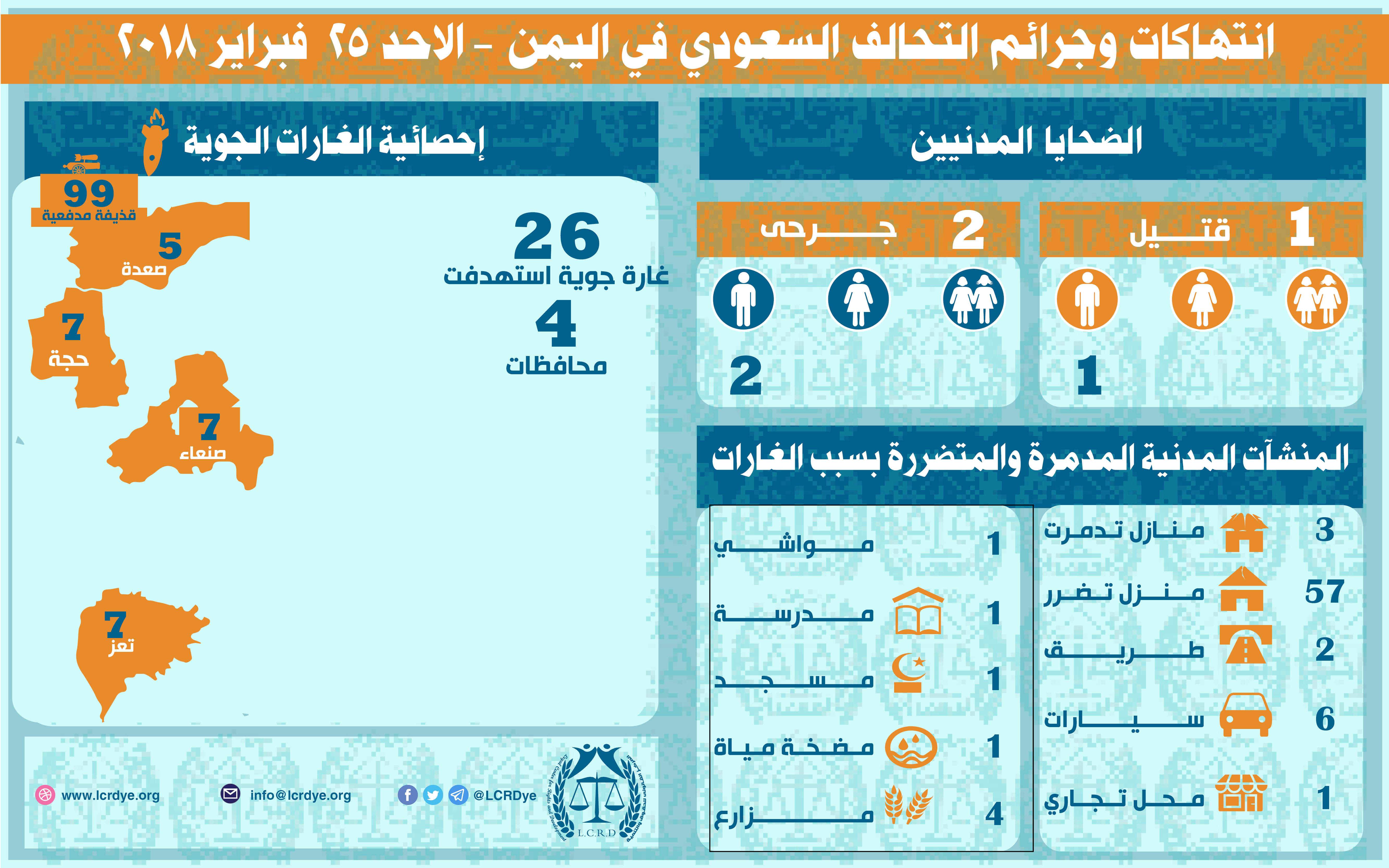 انتهاكات التحالف السعودي في اليمن 25 فبراير 2018 Last updated فبراير 26, 2018 للتحميل https://www.lcrdye.org/wp-content/uploads/2018/02/25-2-2018.pdf استهداف المنشآت المدنيةالتحالف السعوديالمركز القانوني للحقوق والتنميةاليمن Share FacebookTwitterGoogle+ReddItWhatsAppPinterestالبريد الإلكتروني