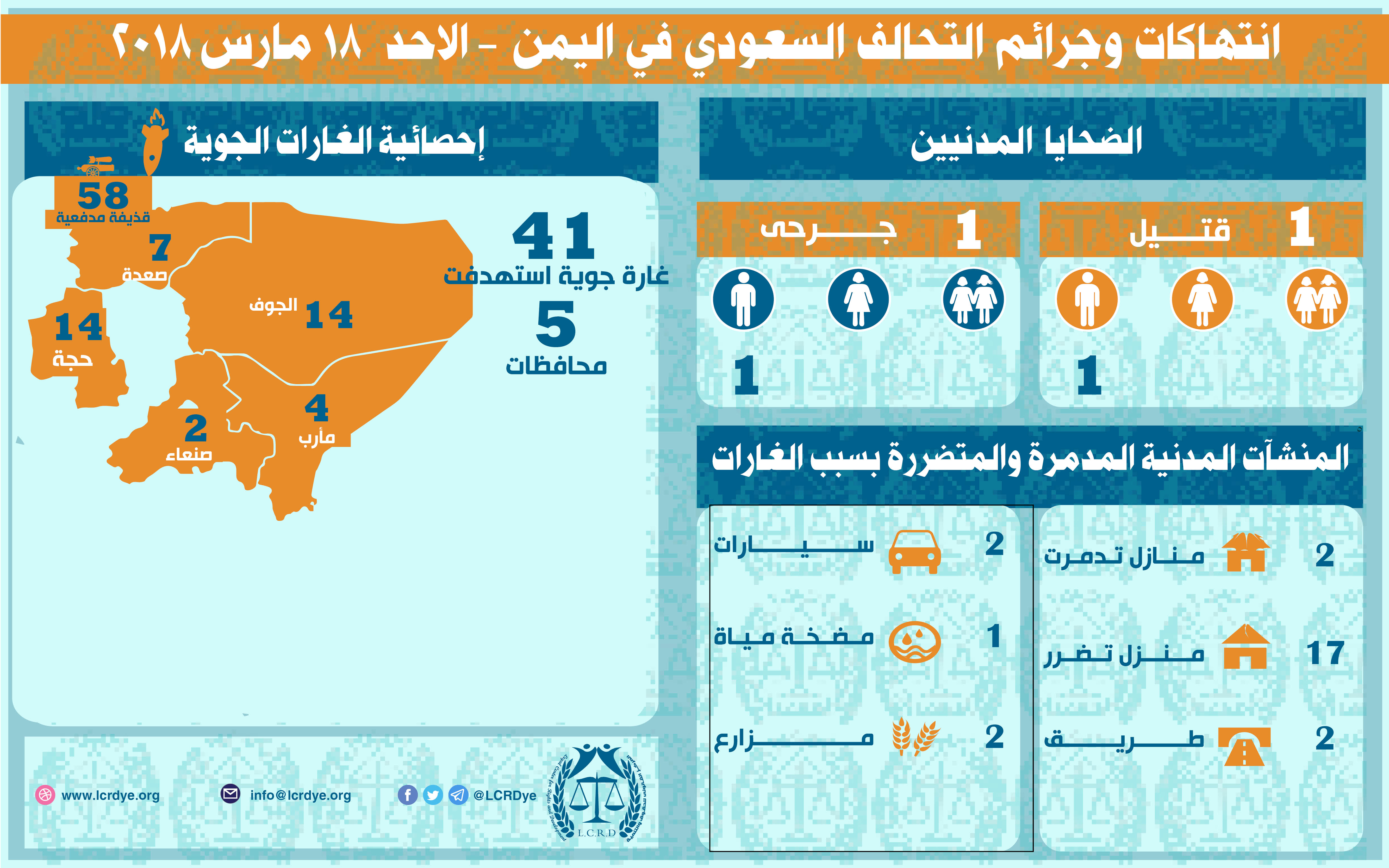 انتهاكات التحالف السعودي في اليمن 18 مارس 2018 Last updated مارس 19, 2018 للتحميل https://www.lcrdye.org/wp-content/uploads/2018/03/18-3-2018-1.pdf Share FacebookTwitterGoogle+ReddItWhatsAppPinterestالبريد الإلكتروني