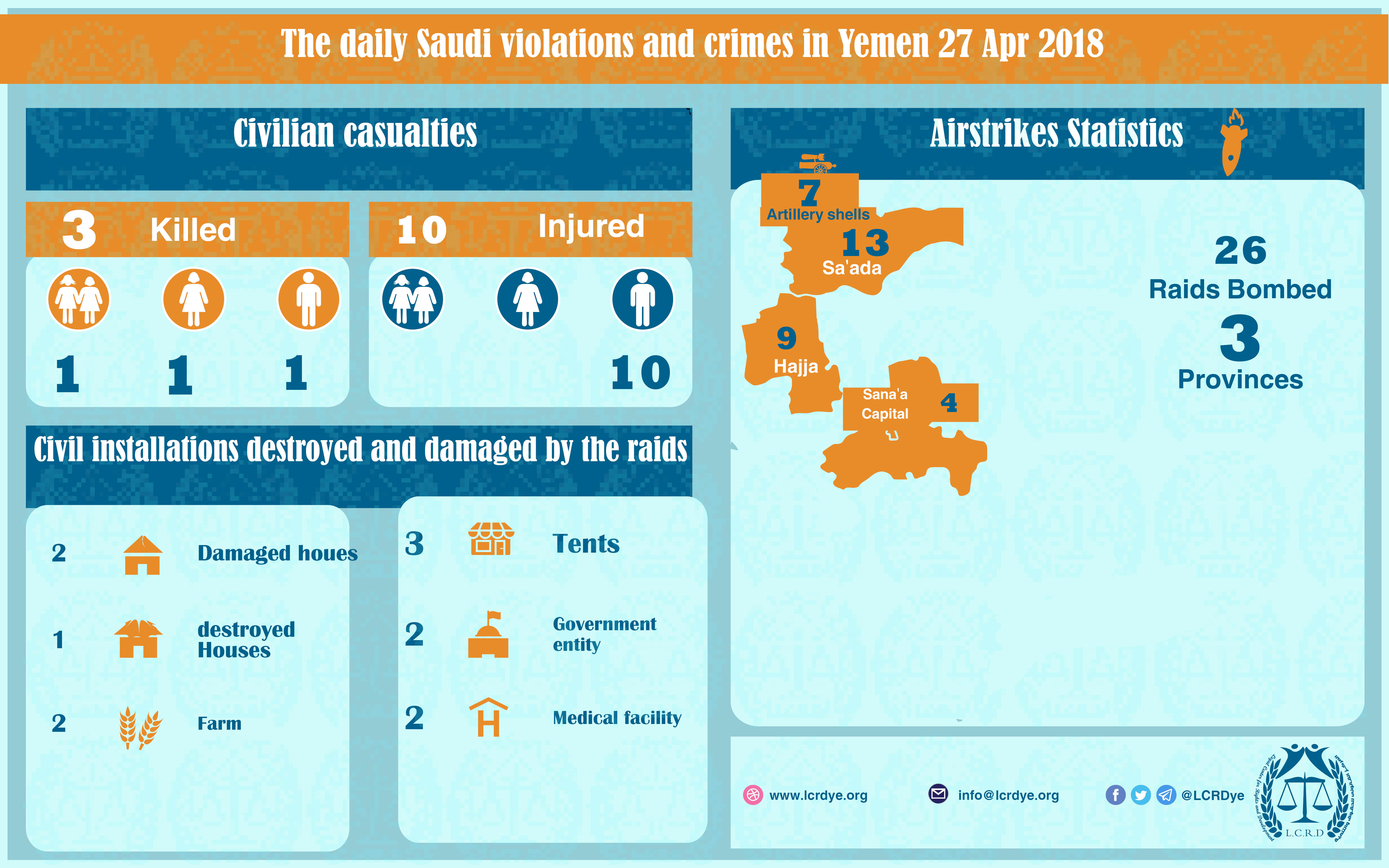 The Daily Violation and Crimes observation Report that are committed by the Saudi Arabia and its collation in 27-4-2018 Share For download https://www.lcrdye.org/wp-content/uploads/2018/04/27-Apr-2018.pdf legal center for right and developmentSaudi coalition CrimesViolation war lawsYemen Share FacebookTwitterGoogle+ReddItWhatsAppPinterestEmail