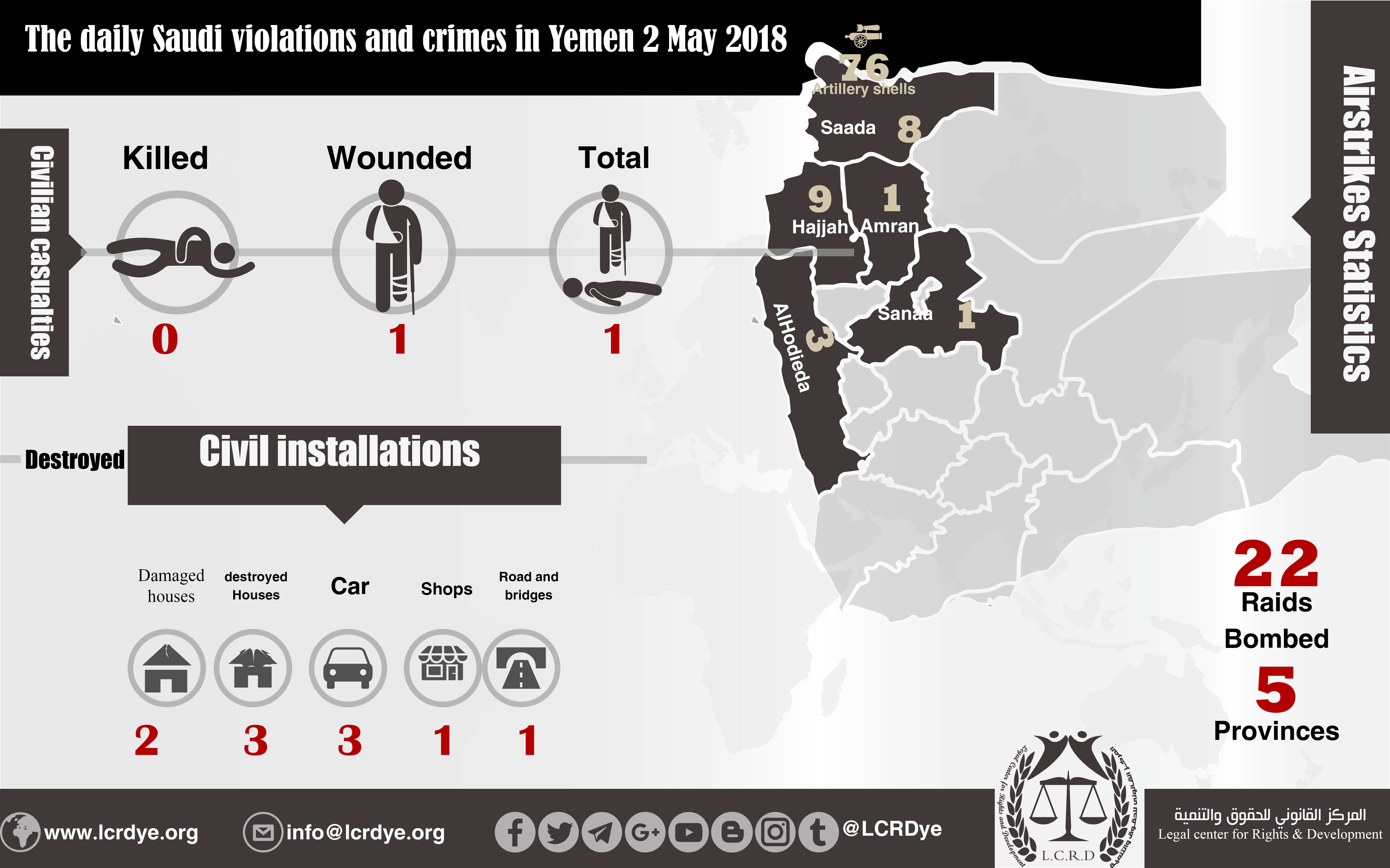 The Daily Violation and Crimes observation Report that are committed by the Saudi Arabia and its collation in 2-5-2018 Share For download https://www.lcrdye.org/wp-content/uploads/2018/05/2-May-2018.pdf legal center for right and developmentSaudi coalition CrimesViolation war lawsYemen Share FacebookTwitterGoogle+ReddItWhatsAppPinterestEmail