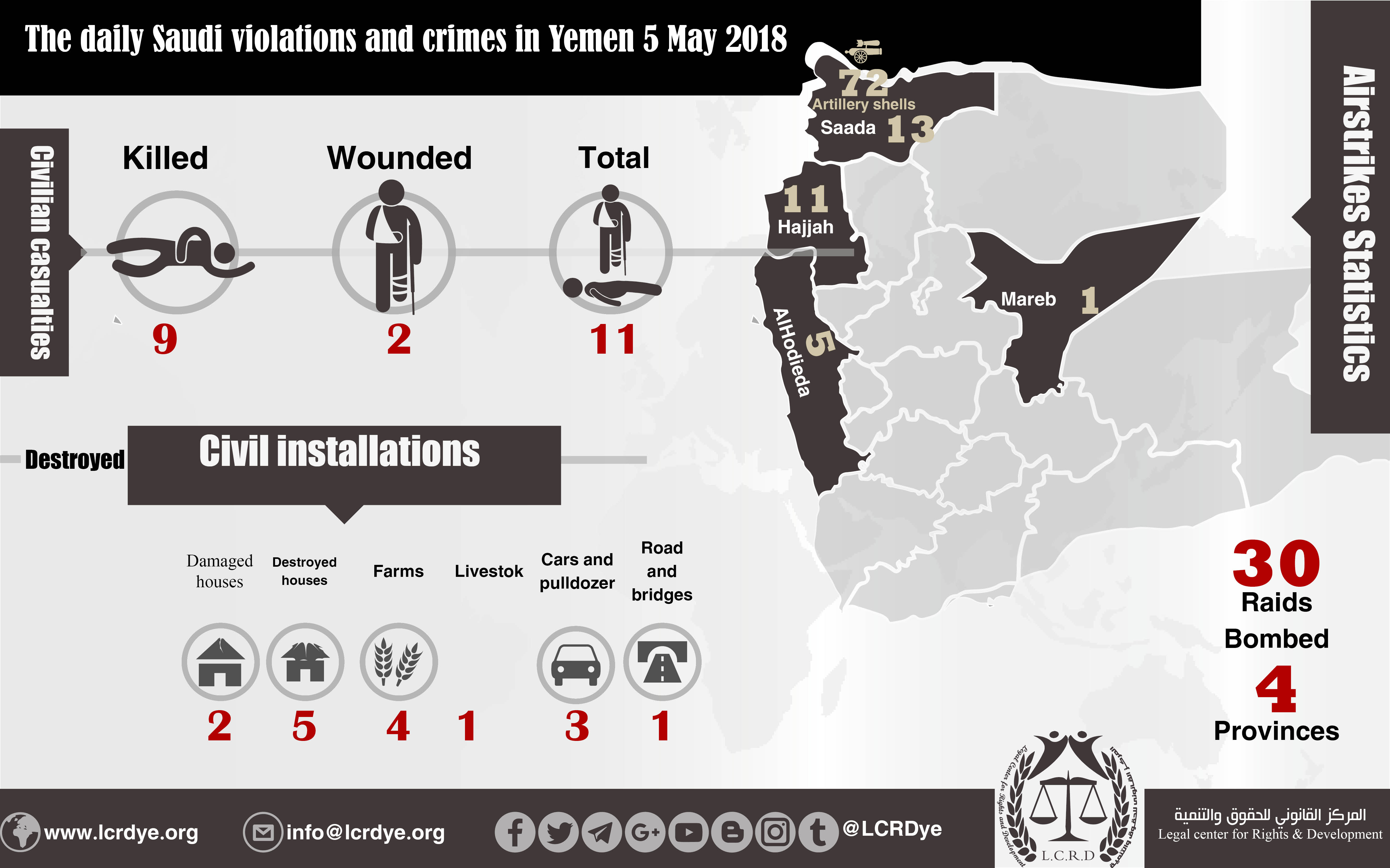 The Daily Violation and Crimes observation Report that are committed by the Saudi Arabia and its collation in 5-5-2018 Share For download https://www.lcrdye.org/wp-content/uploads/2018/05/5-May-2018.pdf legal center for right and developmentSaudi coalition CrimesViolation war lawsYemen Share FacebookTwitterGoogle+ReddItWhatsAppPinterestEmail