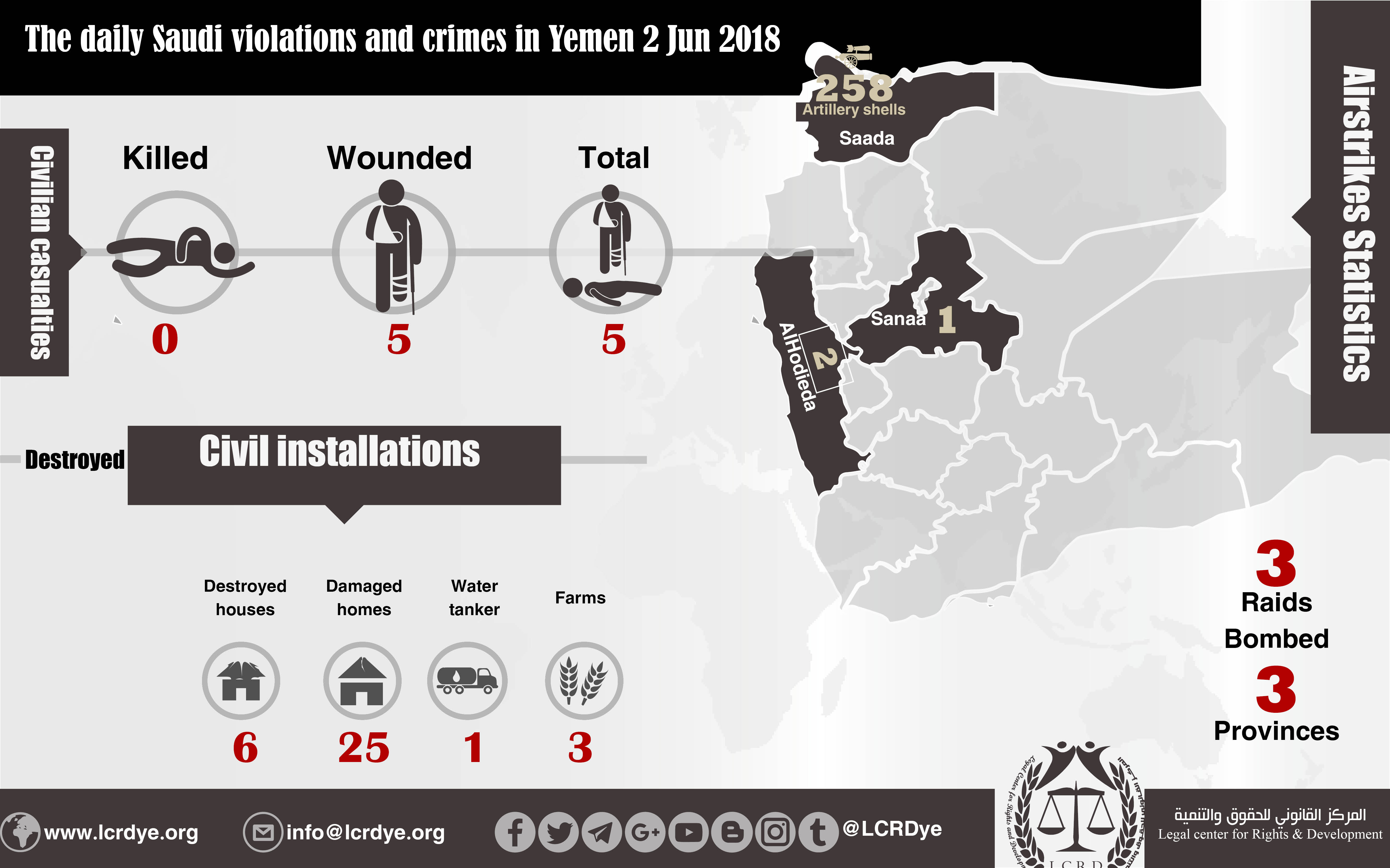 The Daily Violation and Crimes observation Report that are committed by the Saudi Arabia and its collation in 2-6-2018 Share For download https://www.lcrdye.org/wp-content/uploads/2018/06/2-Jun-2018.pdf legal center for right and developmentSaudi coalition CrimesViolation war lawsYemen Share FacebookTwitterGoogle+ReddItWhatsAppPinterestEmail