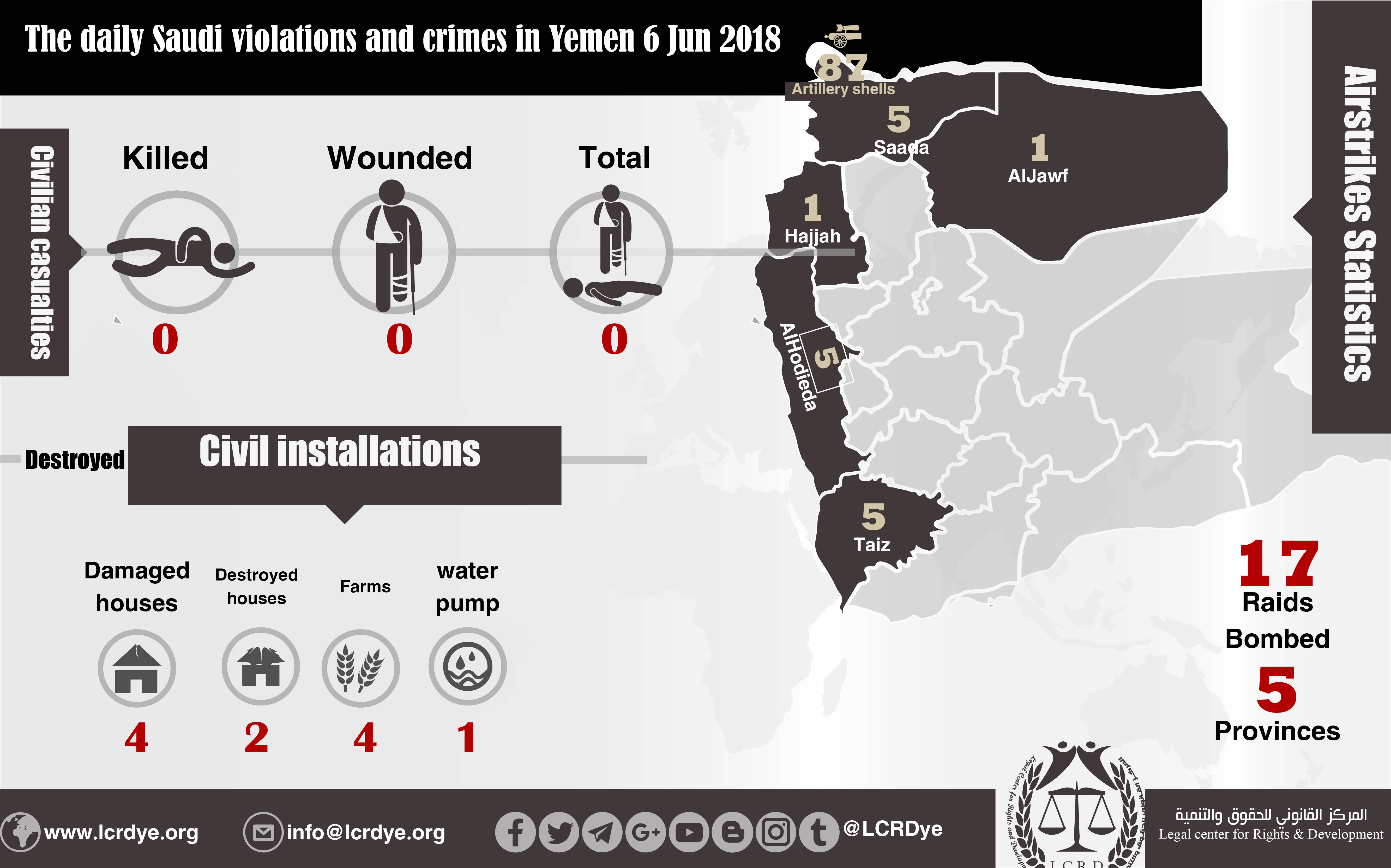 The Daily Violation and Crimes observation Report that are committed by the Saudi Arabia and its collation in 6-6-2018 Share For download https://www.lcrdye.org/wp-content/uploads/2018/06/6-Jun-2018.pdf legal center for right and developmentSaudi coalition CrimesViolation war lawsYemen Share FacebookTwitterGoogle+ReddItWhatsAppPinterestEmail