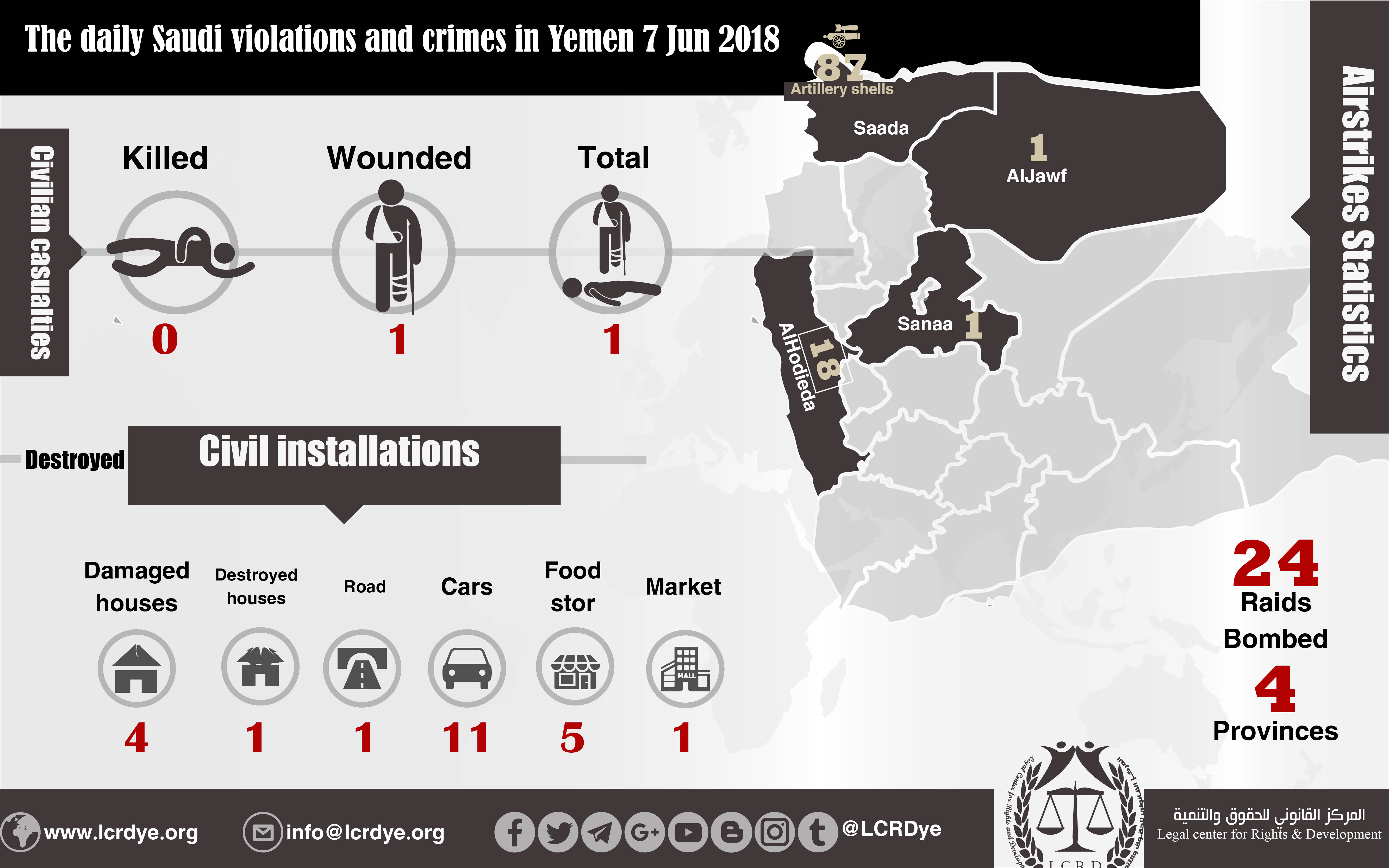 The Daily Violation and Crimes observation Report that are committed by the Saudi Arabia and its collation in 7-6-2018 Share For download https://www.lcrdye.org/wp-content/uploads/2018/06/7-Jun-2018.pdf legal center for right and developmentSaudi coalition CrimesViolation war lawsYemen Share FacebookTwitterGoogle+ReddItWhatsAppPinterestEmail