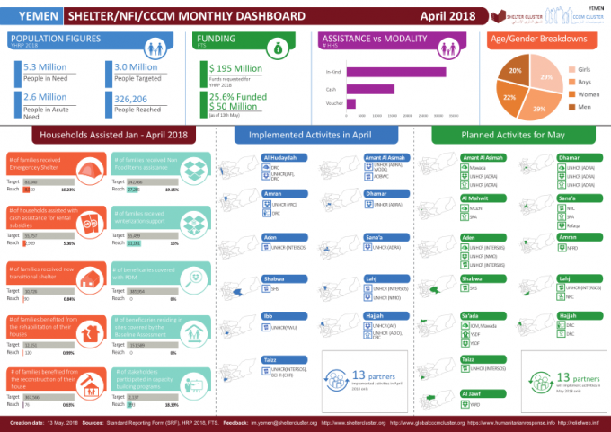 Yemen: Shelter/NFI/CCCM Cluster Dashboard for April 2018 Share Yemen: Shelter/NFI/CCCM Cluster Dashboard for April 2018 Share FacebookTwitterGoogle+ReddItWhatsAppPinterestEmail
