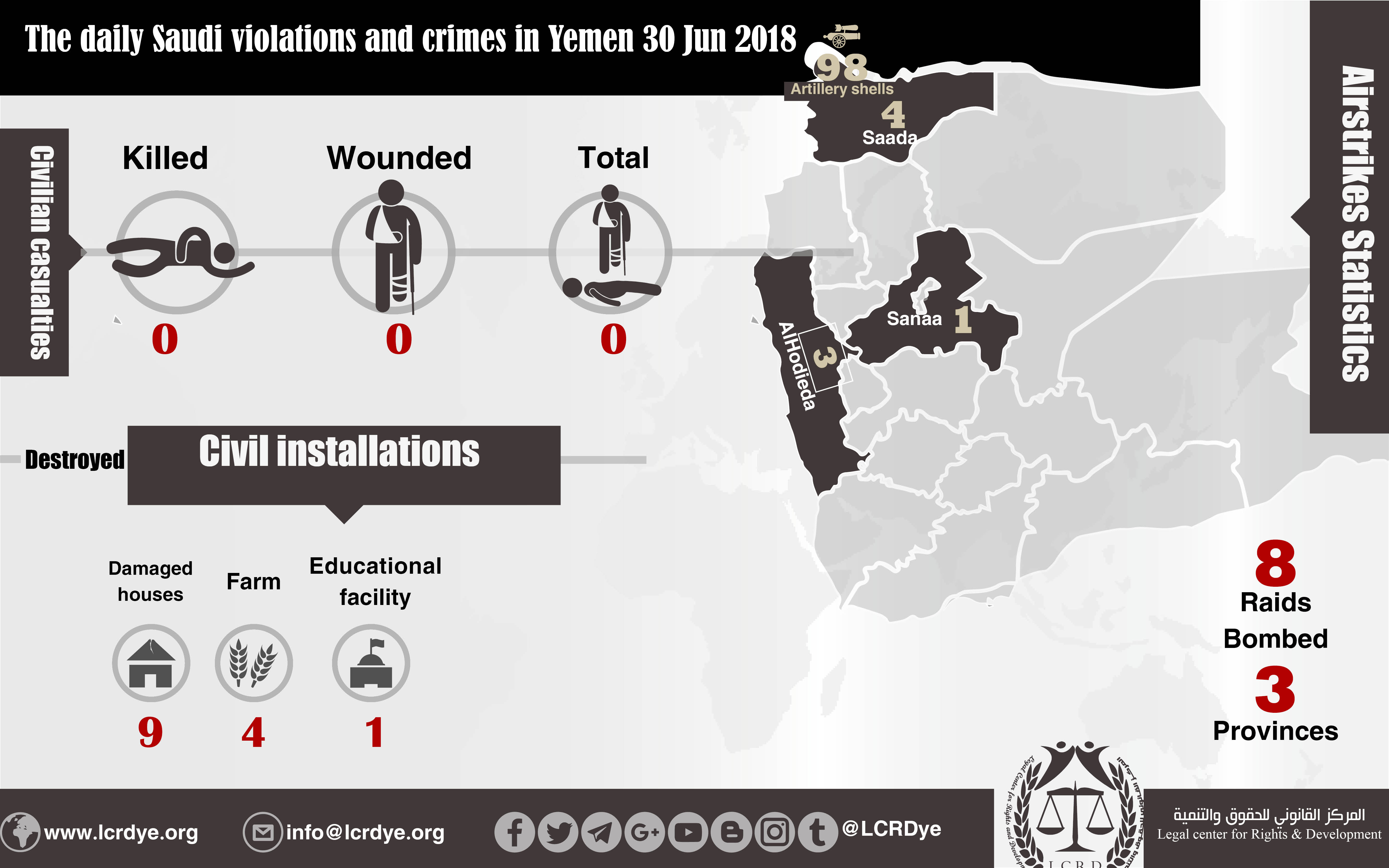 The daily Saudi violations and crimes in Yemen 30 Jun 2018 Share For download https://www.lcrdye.org/wp-content/uploads/2018/07/30-Jun-2018.pdf legal center for right and developmentSaudi coalition CrimesViolation war lawsYemen Share FacebookTwitterGoogle+ReddItWhatsAppPinterestEmail