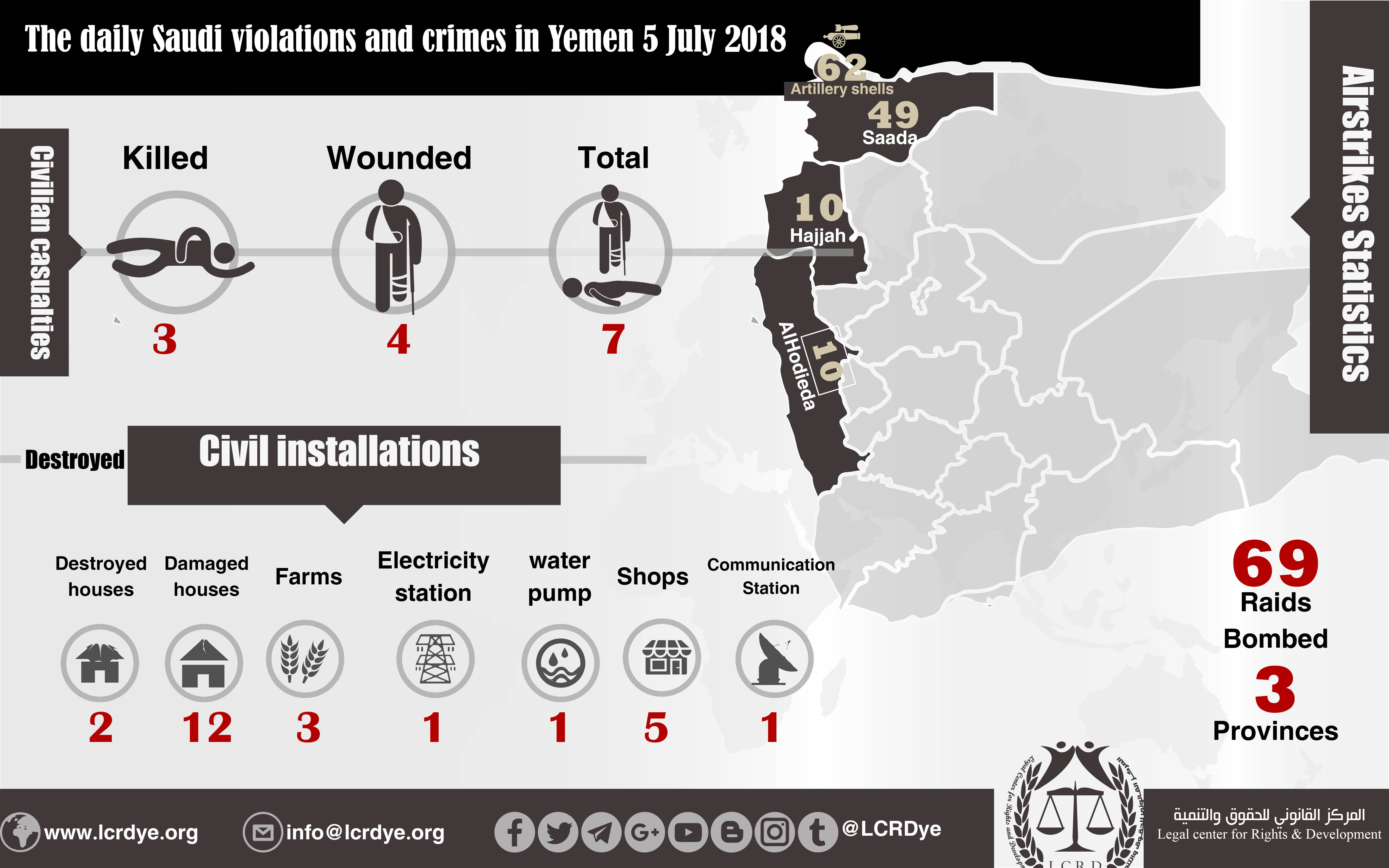 The daily report of the Saudi violations and crimes in Yemen 5 July 2018 Share For download https://www.lcrdye.org/wp-content/uploads/2018/07/5-July-2018.pdf legal center for right and developmentSaudi coalition CrimesViolation war lawsYemen Share FacebookTwitterGoogle+ReddItWhatsAppPinterestEmail