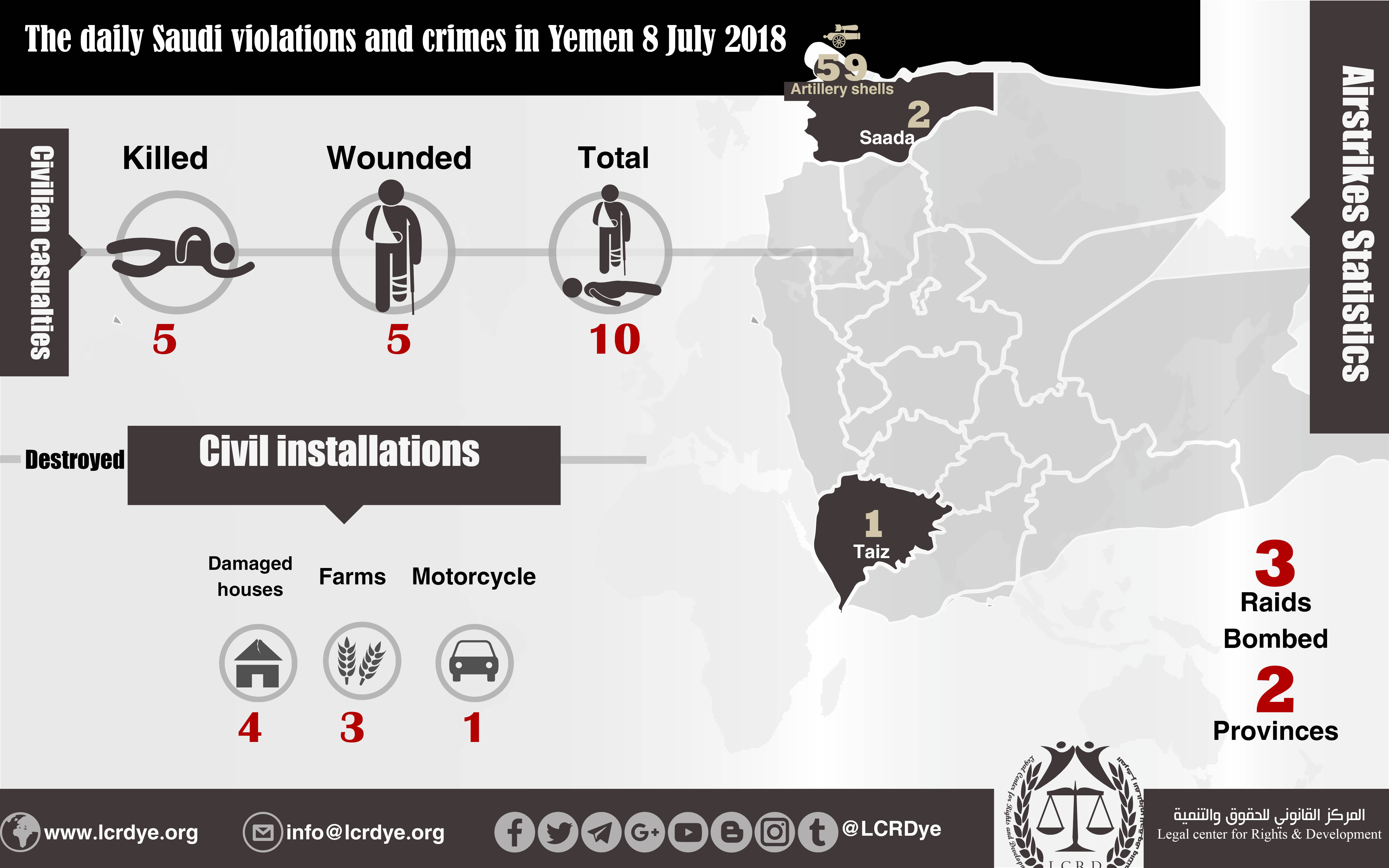 The daily report of the Saudi violations and crimes in Yemen 8 July 2018 Share For download https://www.lcrdye.org/wp-content/uploads/2018/07/8-July-2018.pdf legal center for right and developmentSaudi coalition CrimesViolation war lawsYemen Share FacebookTwitterGoogle+ReddItWhatsAppPinterestEmail