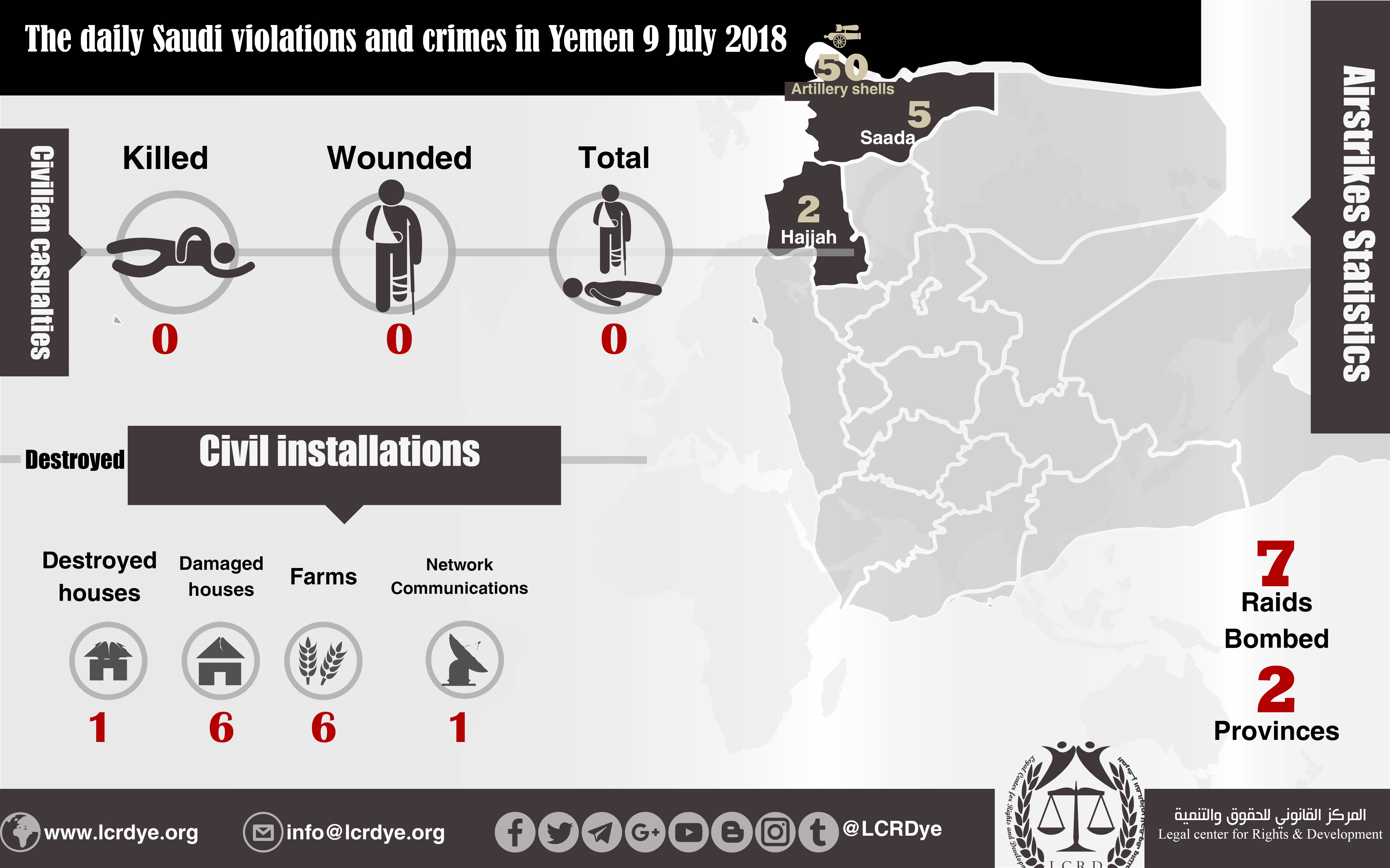 The daily report of the Saudi violations and crimes in Yemen 9 July 2018 Share For download https://www.lcrdye.org/wp-content/uploads/2018/07/9-July-2018.pdf legal center for right and developmentSaudi coalition CrimesViolation war lawsYemen Share FacebookTwitterGoogle+ReddItWhatsAppPinterestEmail