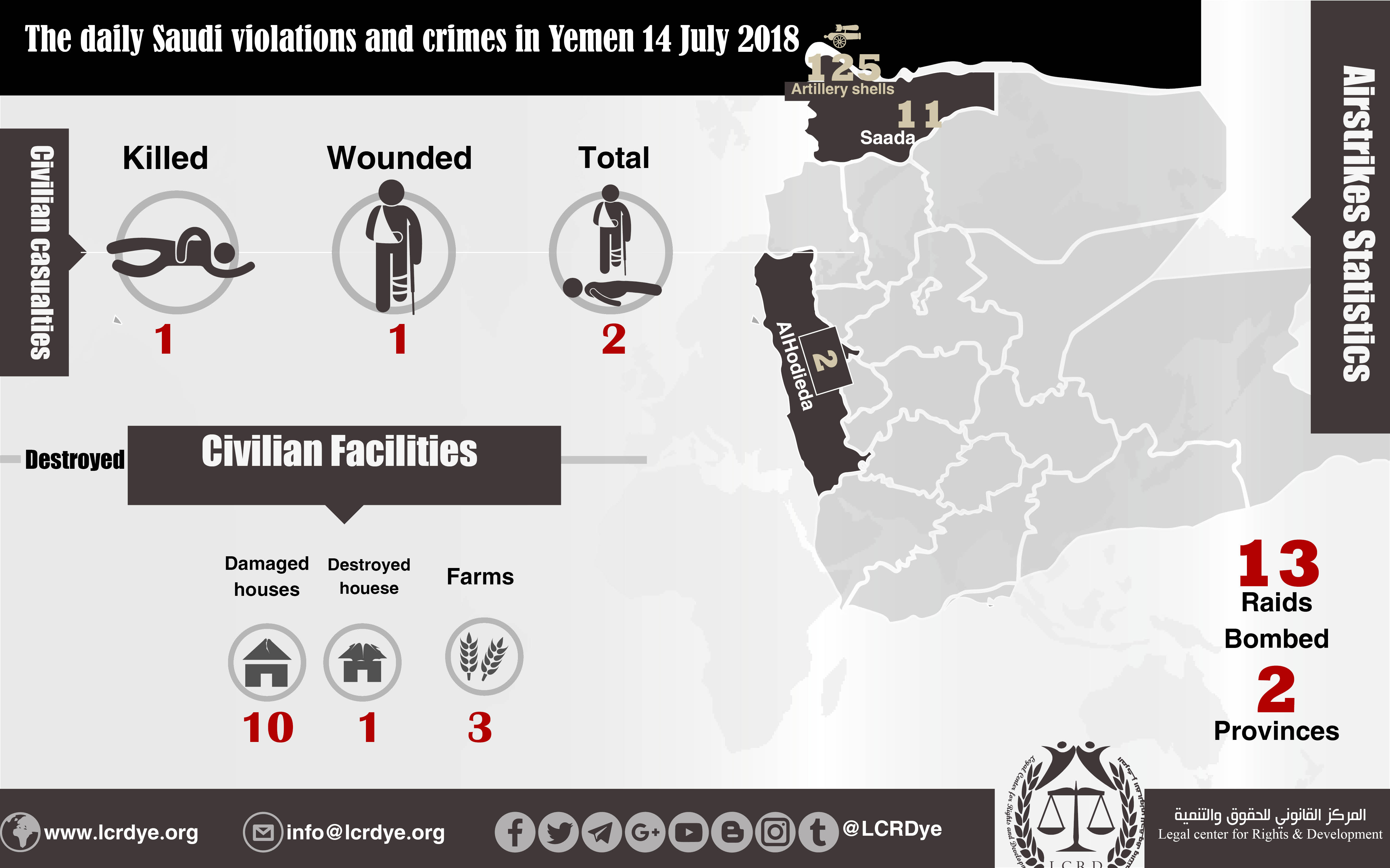 The daily report of the Saudi violations and crimes in Yemen 14 July 2018 Share For download https://www.lcrdye.org/wp-content/uploads/2018/07/14-July-2018.pdf legal center for right and developmentSaudi coalition CrimesViolation war lawsYemen Share FacebookTwitterGoogle+ReddItWhatsAppPinterestEmail