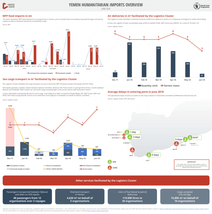 In June, VOS Apollo transported 48 mt/215 m3 of cargo from Djibouti to Aden on behalf of Global Medic, IRC, MSF France, WFP and WHO; VOS Theia transported 86 mt/416 m3 of relief items from Djibouti to Hodeidah on behalf of UNICEF, and WHO.
