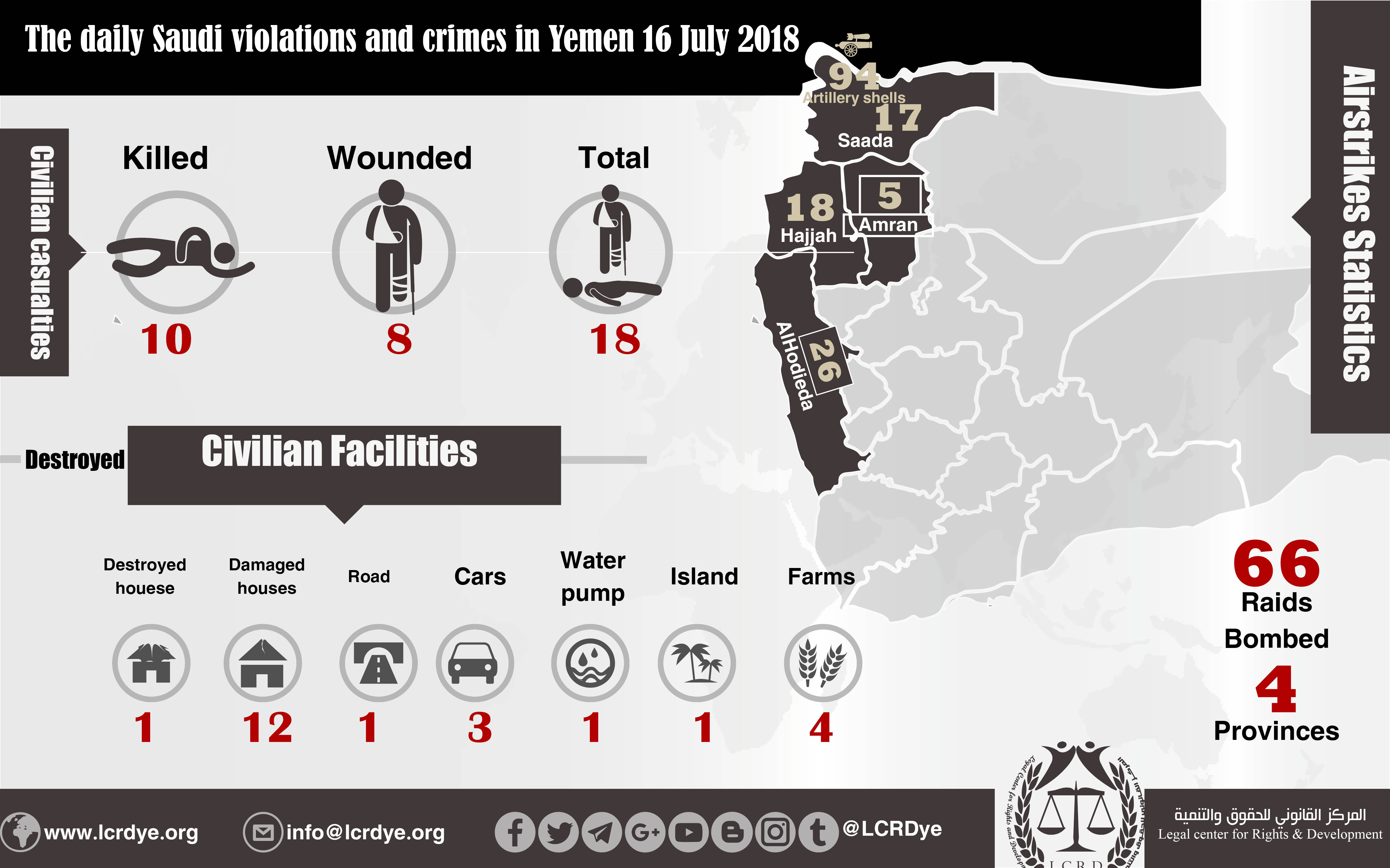 The daily report of the Saudi violations and crimes in Yemen 16 July 2018 Share For download https://www.lcrdye.org/wp-content/uploads/2018/07/16-July-2018.pdf legal center for right and developmentSaudi coalition CrimesViolation war lawsYemen Share FacebookTwitterGoogle+ReddItWhatsAppPinterestEmail