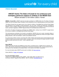 UNICEF thanks The State of Kuwait for its continuous and exemplary generous support to children in the Middle East