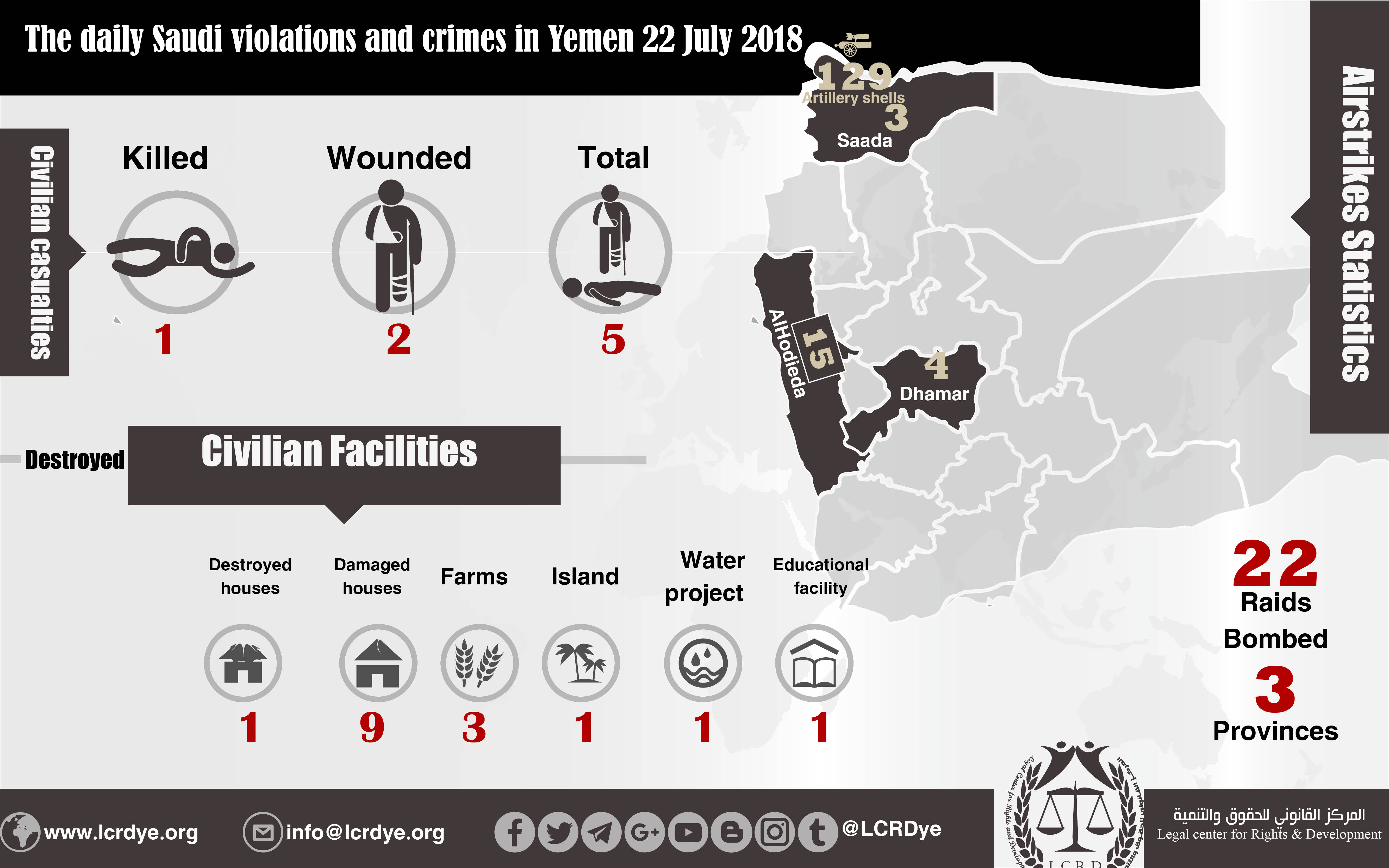 The daily report of the Saudi violations and crimes in Yemen 22 July 2018 Share For download https://www.lcrdye.org/wp-content/uploads/2018/07/22-July-2018.pdf legal center for right and developmentSaudi coalition CrimesViolation war lawsYemen Share FacebookTwitterGoogle+ReddItWhatsAppPinterestEmail