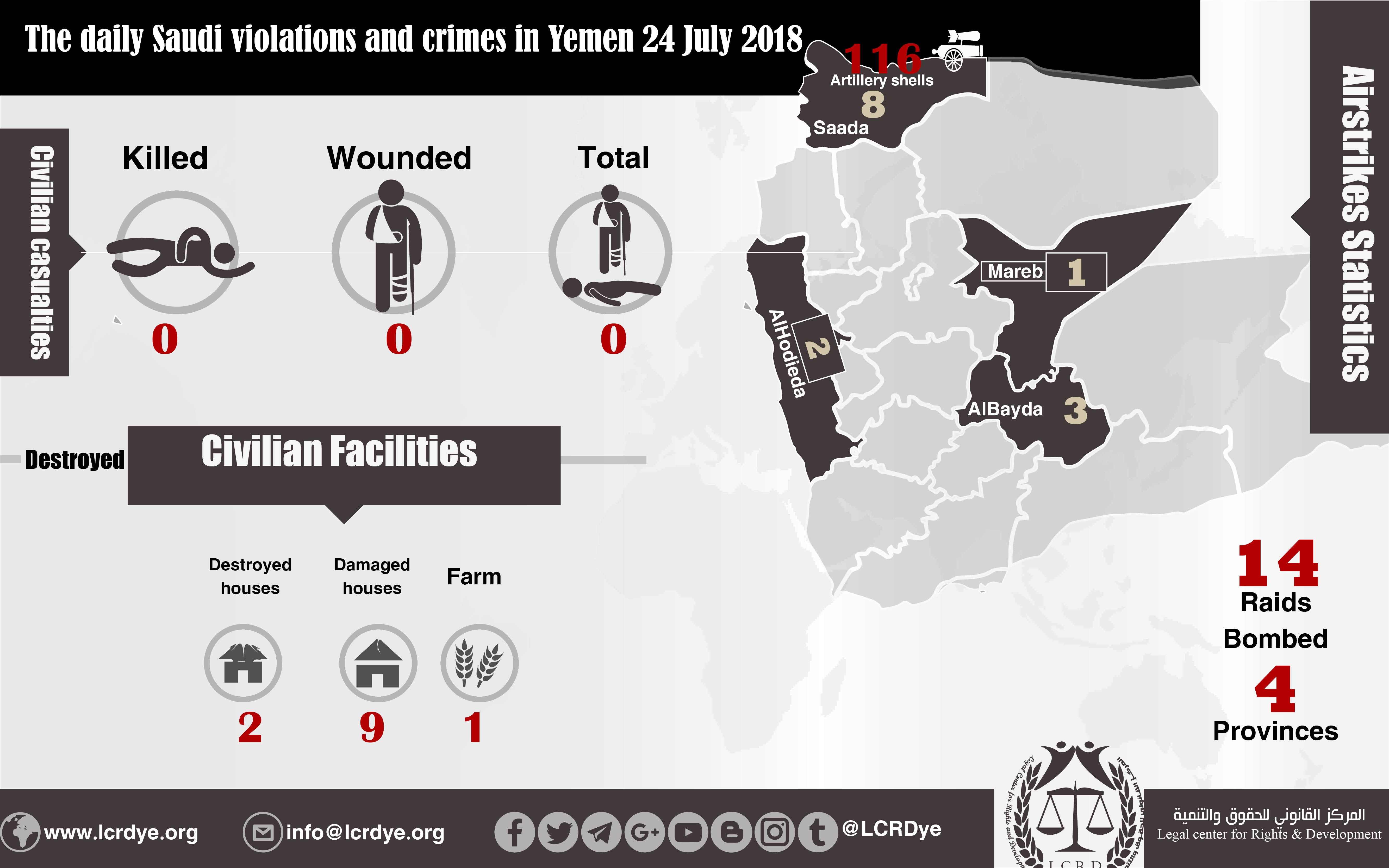 The daily report of the Saudi violations and crimes in Yemen 24 July 2018 Share For download https://www.lcrdye.org/wp-content/uploads/2018/07/24-July-2018.pdf legal center for right and developmentSaudi coalition CrimesViolation war lawsYemen Share FacebookTwitterGoogle+ReddItWhatsAppPinterestEmail