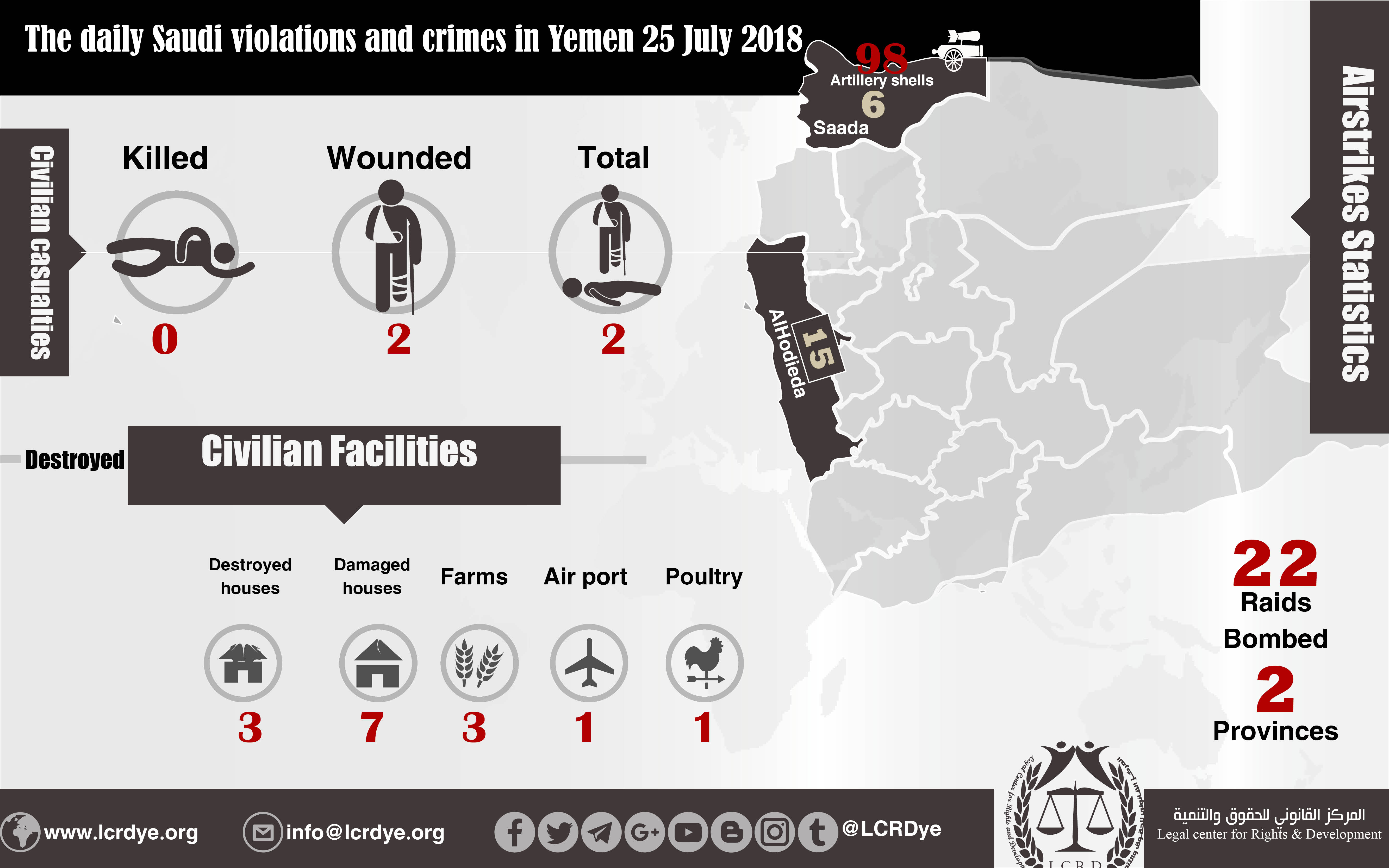 The daily report of the Saudi violations and crimes in Yemen 25 July 2018 Share For download https://www.lcrdye.org/wp-content/uploads/2018/07/25-July-2018-1.pdf legal center for right and developmentSaudi coalition CrimesViolation war lawsYemen Share FacebookTwitterGoogle+ReddItWhatsAppPinterestEmail