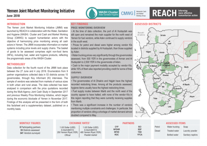 The Yemen Joint Market Monitoring Initiative (JMMI) was launched by REACH in collaboration with the Water, Sanitation and Hygiene (WASH) Cluster and Cash and Market Working Group (CMWG) to support humanitarian actors with the objective of harmonizing price monitoring among all cash actors in Yemen. The JMMI incorporates information on market systems including price levels and supply chains. The basket of goods to be assessed comprises eight non-food items (NFIs), including fuel, water and hygiene products, reflecting the programmatic areas of the WASH Cluster.