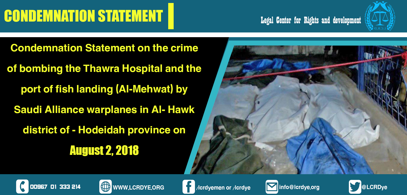 legal Center for rights and development stands on the crimes of direct, deliberate and systematic targeting for civilians in Yemen by the Saudi coalition warplanes, which recently highly increased in the province of Hodeidah where the warplanes launched four air strikes on the main gate, the administration building and the southern side of Thawra hospital and four raids targeted the Port of fish landing and fishermen’s hangars (Mehwat).