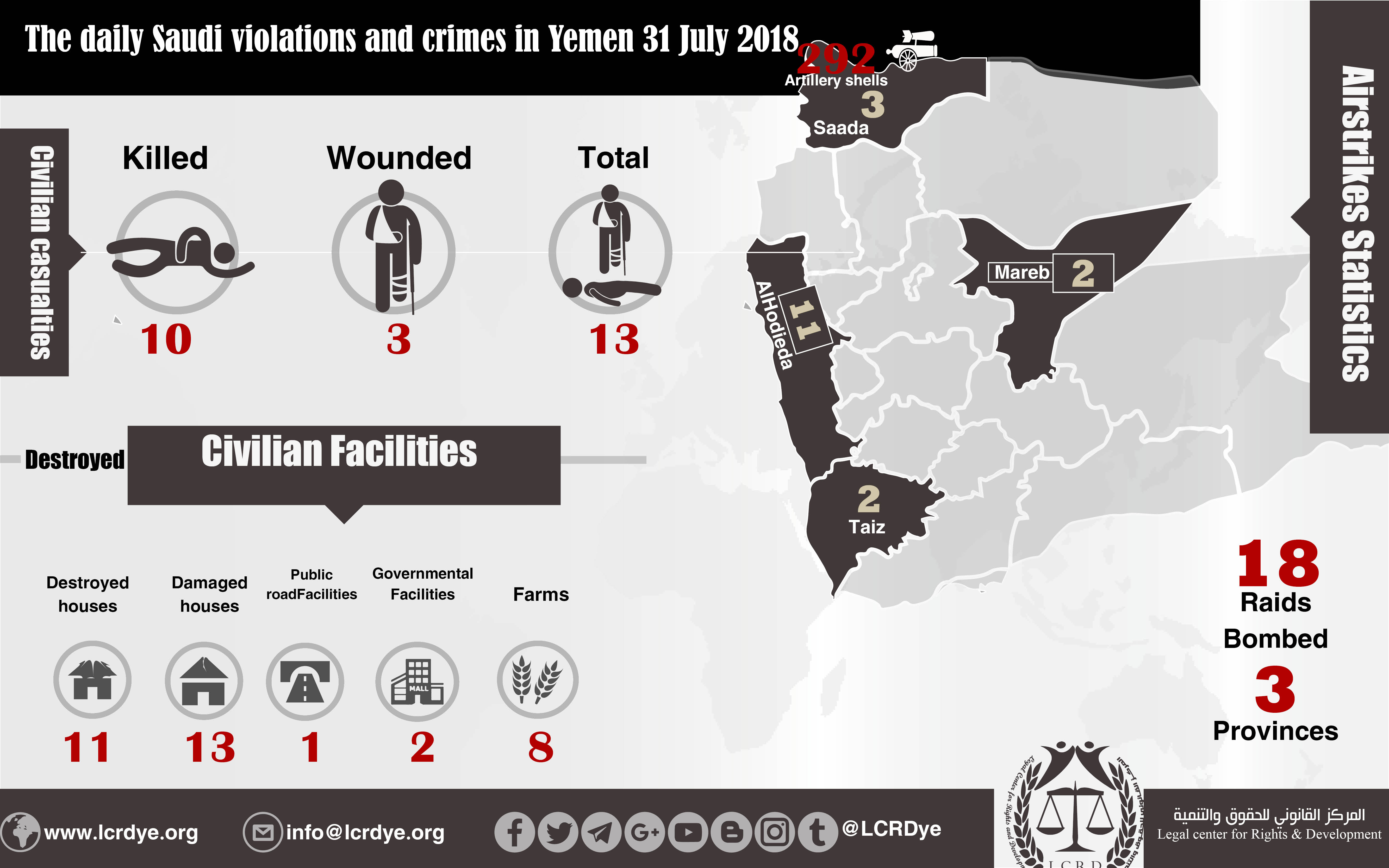 The daily report of the Saudi violations and crimes in Yemen 31 July 2018 Share For download https://www.lcrdye.org/wp-content/uploads/2018/08/31-July-2018.pdf legal center for right and developmentSaudi coalition CrimesViolation war lawsYemen Share FacebookTwitterGoogle+ReddItWhatsAppPinterestEmail