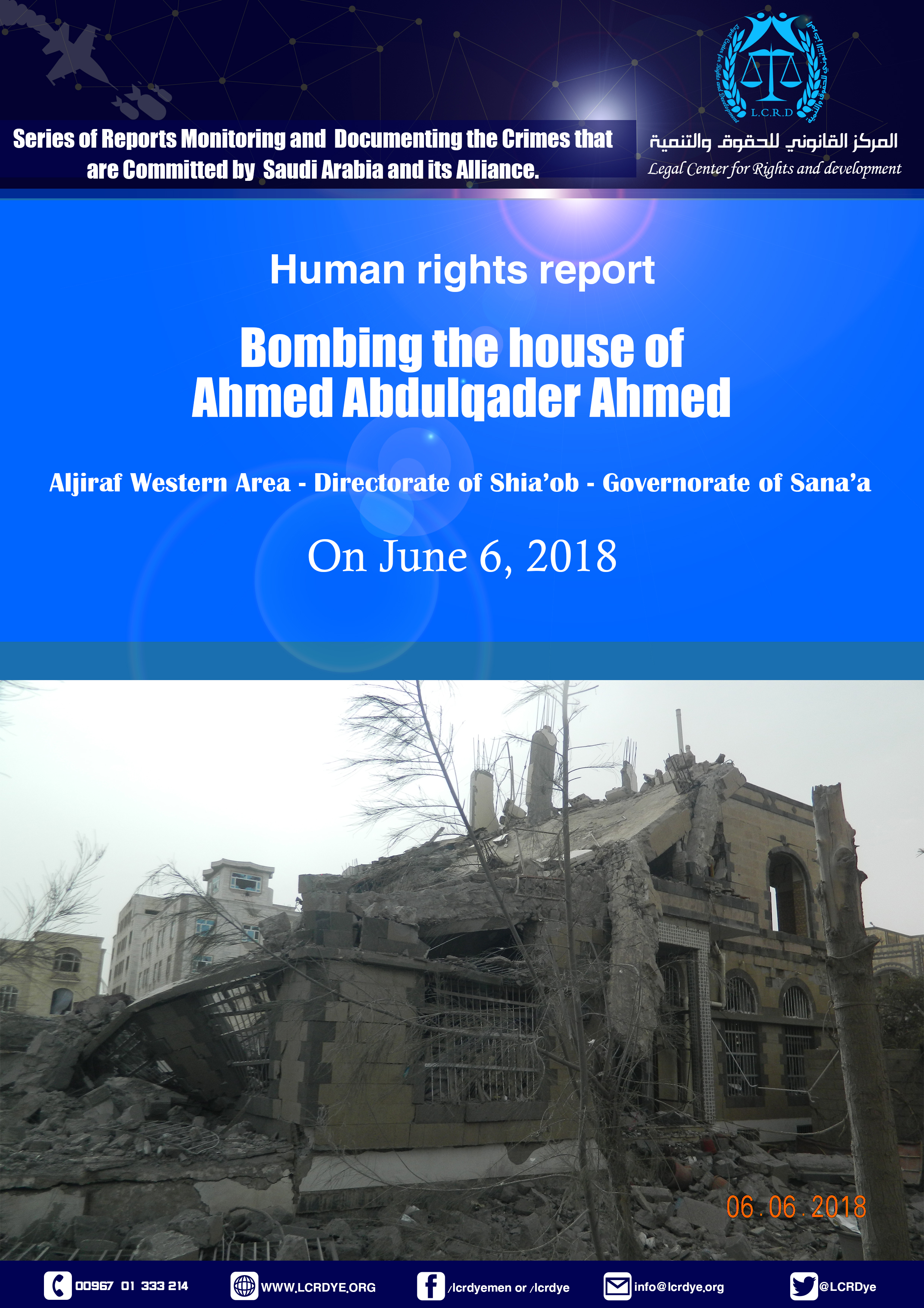 Bombing the house of Ahmed Abdulqader Ahmed Aljiraf Western Area – Directorate of Shia’ob – Governorate of Sana’a On June 6, 2018