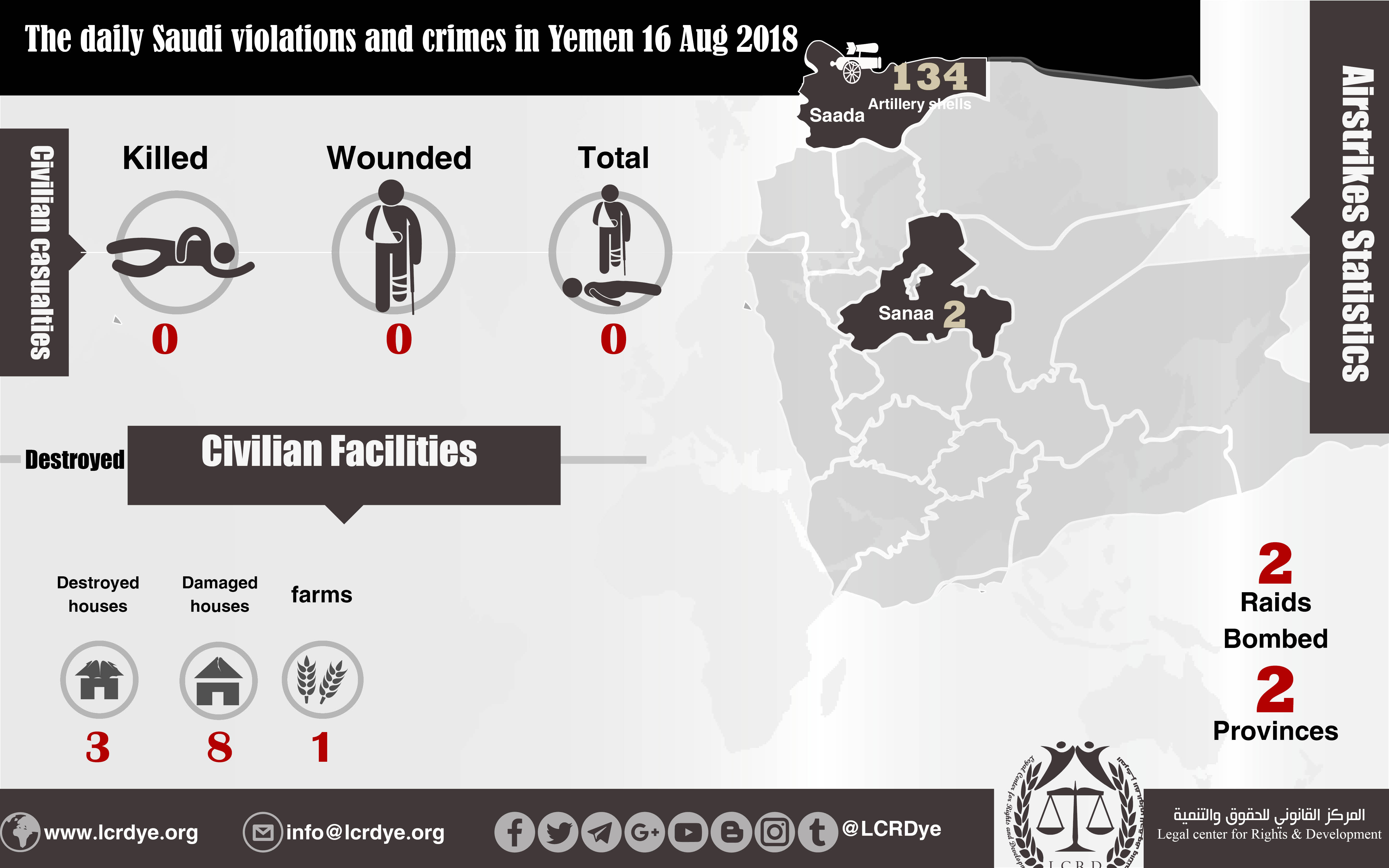 The daily report of the Saudi violations and crimes in Yemen 16 Aug 2018 Share For download https://www.lcrdye.org/wp-content/uploads/2018/08/16-Aug-2018.pdf legal center for right and developmentSaudi coalition CrimesViolation war lawsYemen Share FacebookTwitterGoogle+ReddItWhatsAppPinterestEmail