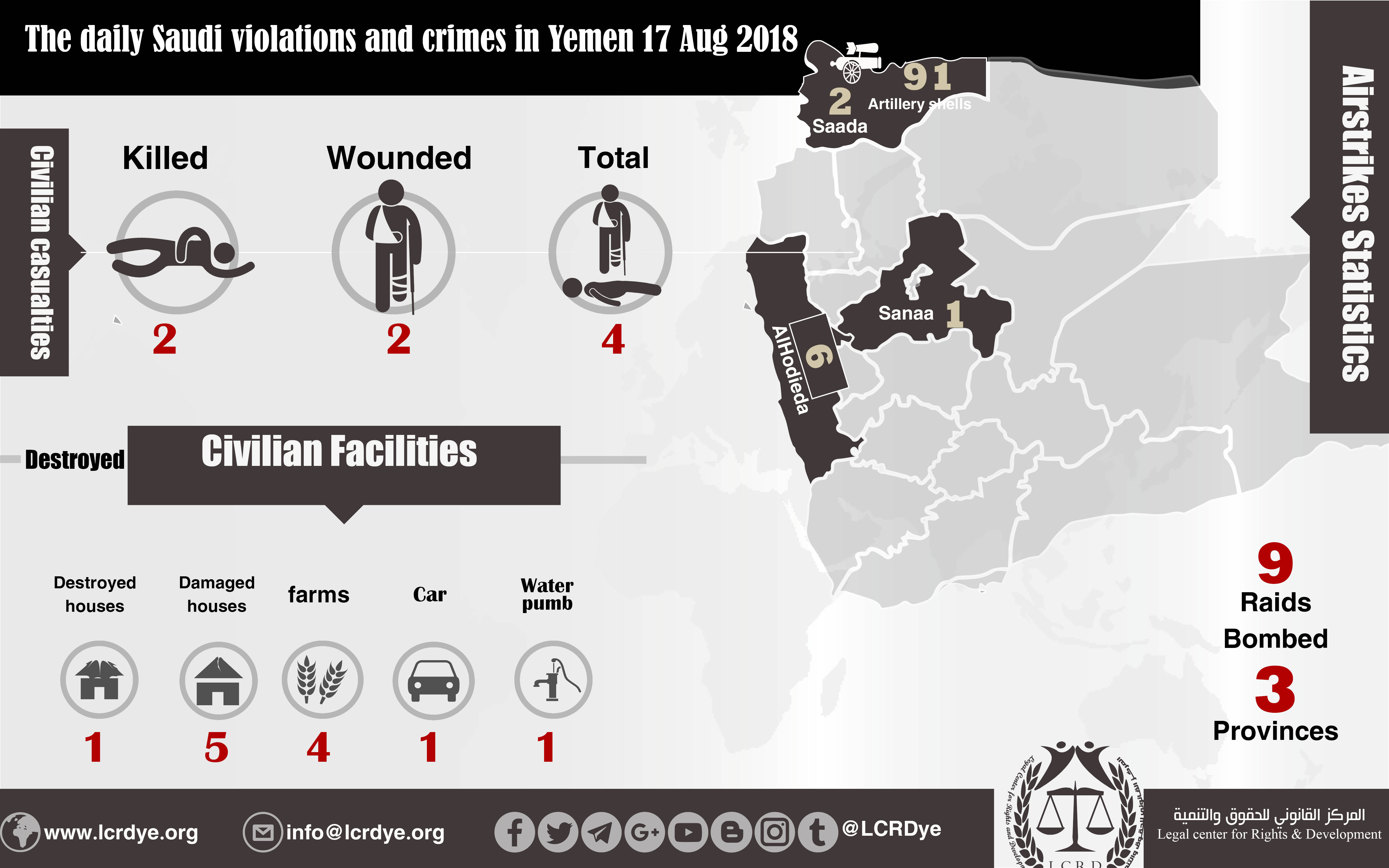 The daily report of the Saudi violations and crimes in Yemen 17 Aug 2018 Share For download https://www.lcrdye.org/wp-content/uploads/2018/08/17-Aug-2018.pdf legal center for right and developmentSaudi coalition CrimesViolation war lawsYemen Share FacebookTwitterGoogle+ReddItWhatsAppPinterestEmail