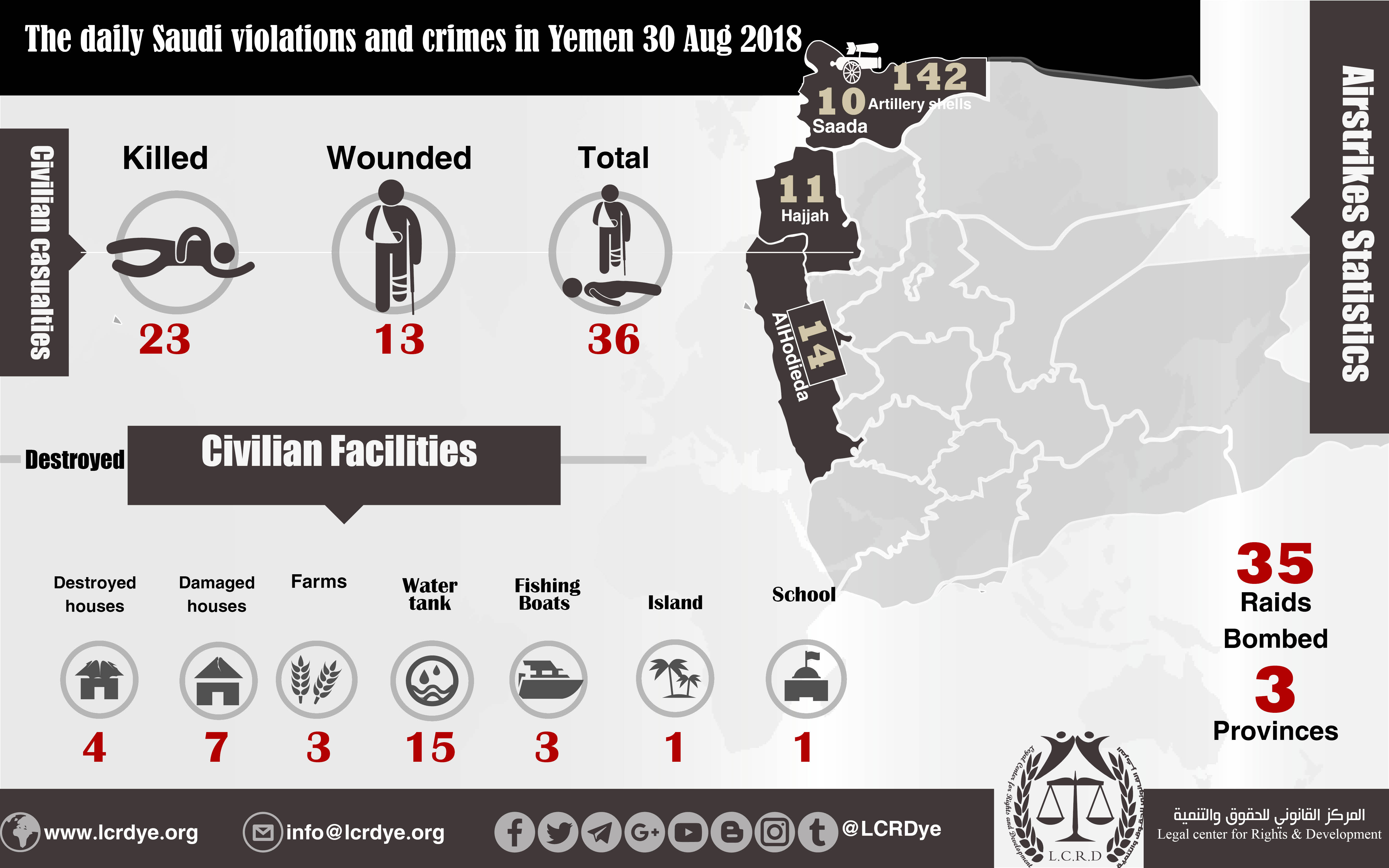 The daily report of the Saudi violations and crimes in Yemen 30 Aug 2018 Share For download https://www.lcrdye.org/wp-content/uploads/2018/08/30-Aug-2018.pdf legal center for right and developmentSaudi coalition CrimesViolation war lawsYemen Share FacebookTwitterGoogle+ReddItWhatsAppPinterestEmail
