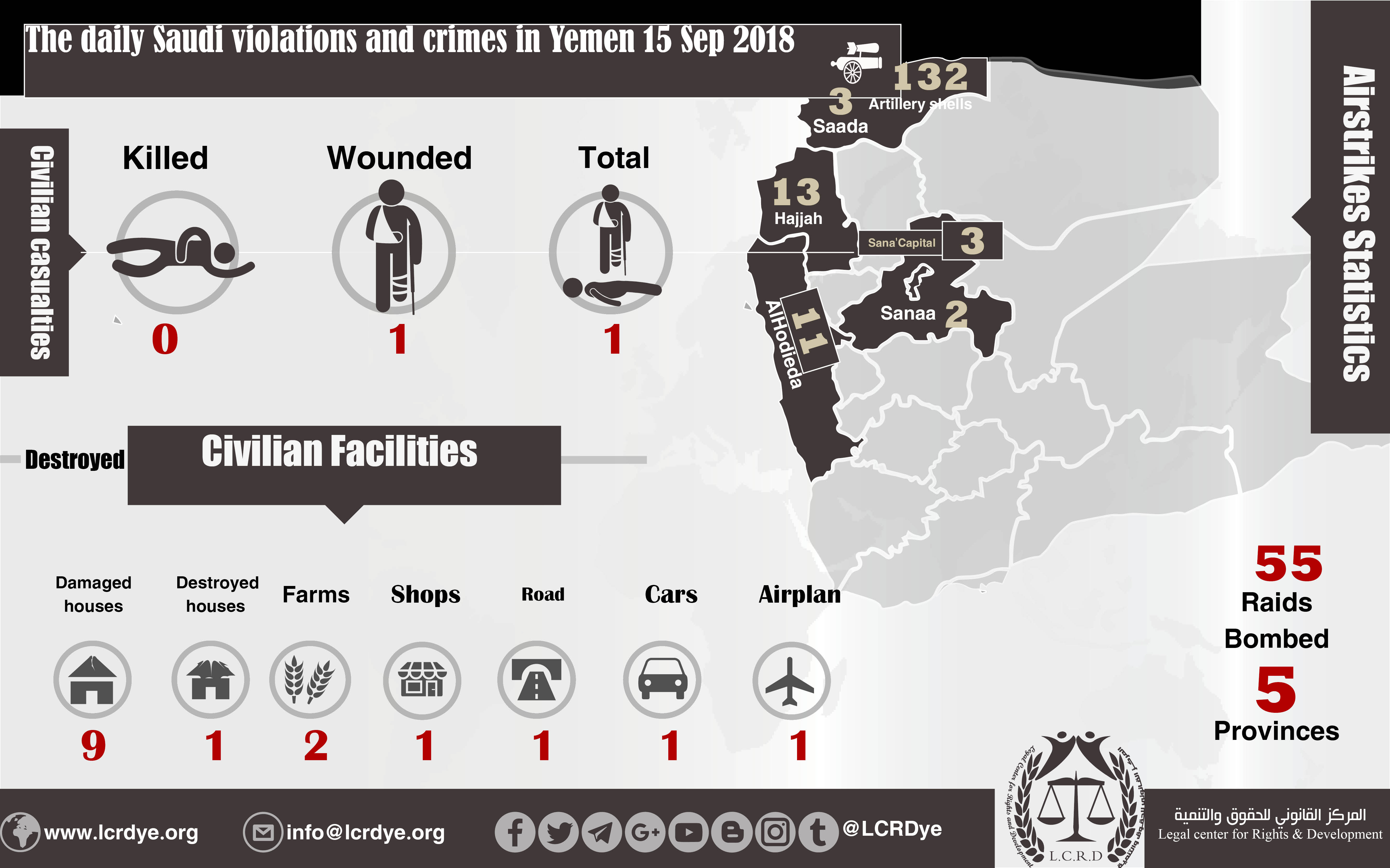 The daily report of the Saudi violations and crimes in Yemen 15 Sep 2018 Share For download https://www.lcrdye.org/wp-content/uploads/2018/09/15-Sep-2018.pdf legal center for right and developmentSaudi coalition CrimesViolation war lawsYemen Share FacebookTwitterGoogle+ReddItWhatsAppPinterestEmail