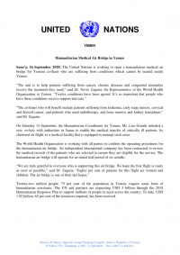 Sana’a, 16 September 2018: The United Nations is working to open a humanitarian medical air bridge for Yemeni civilians who are suffering from conditions which cannot be treated inside Yemen.