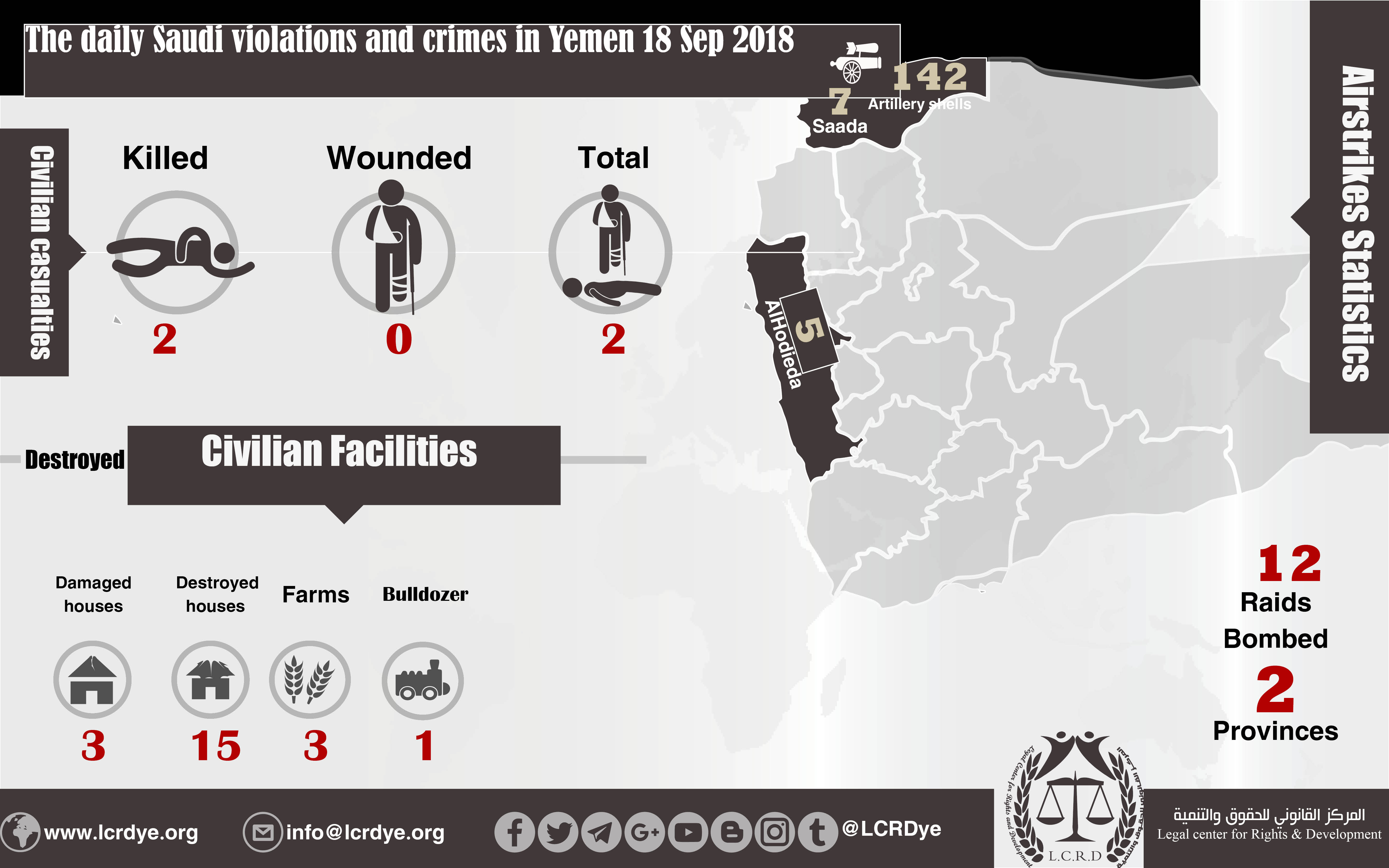 The daily report of the Saudi violations and crimes in Yemen 18 Sep 2018 Share for download : https://www.lcrdye.org/wp-content/uploads/2018/09/18-Sep-2018.pdf legal center for right and developmentSaudi coalition CrimesViolation war lawsYemen Share FacebookTwitterGoogle+ReddItWhatsAppPinterestEmail
