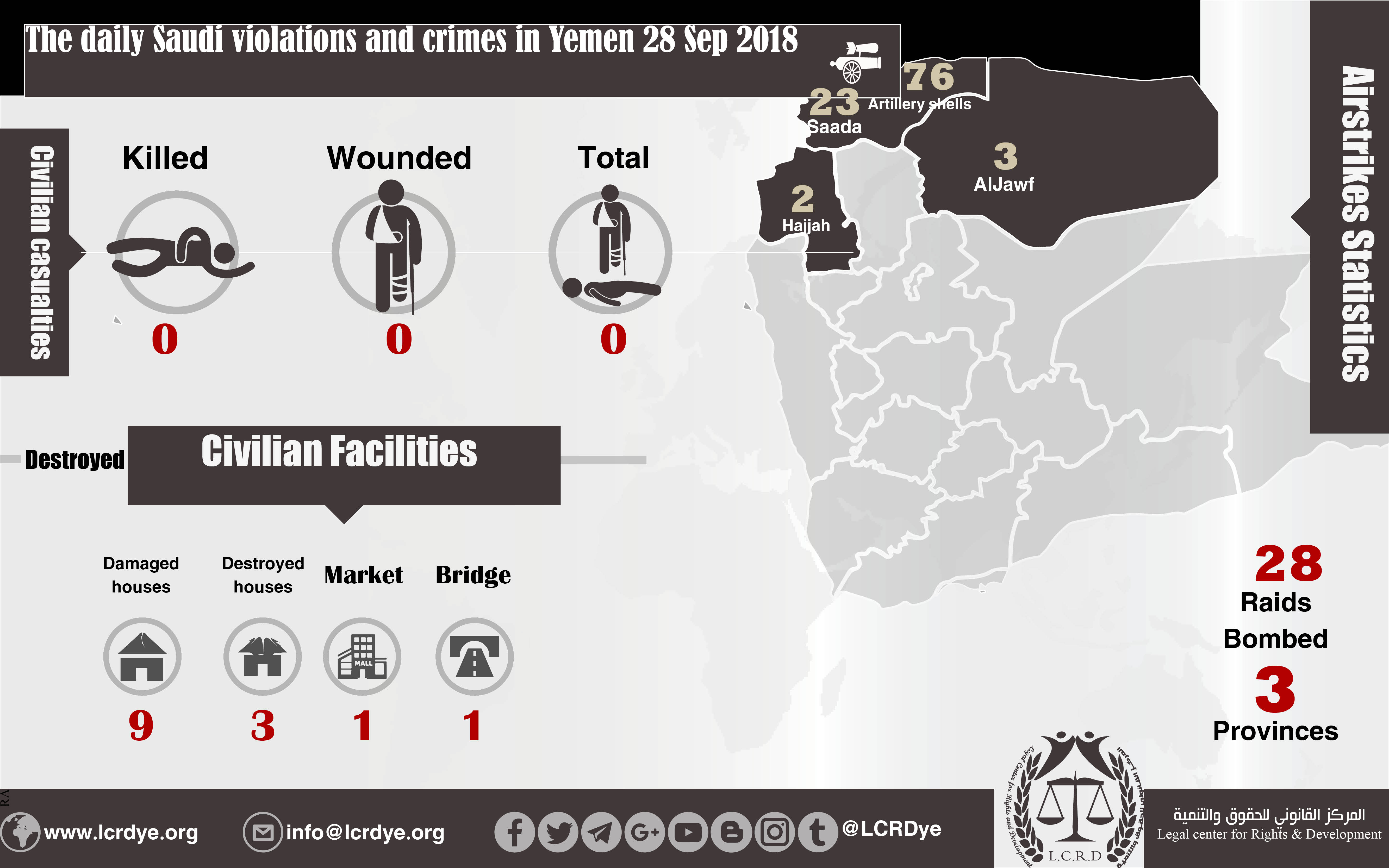 The daily report of the Saudi violations and crimes in Yemen 28 Sep 2018 Share For download : https://www.lcrdye.org/wp-content/uploads/2018/09/28-Sep-2018.pdf legal center for right and developmentSaudi coalition CrimesViolation war lawsYemen Share FacebookTwitterGoogle+ReddItWhatsAppPinterestEmail
