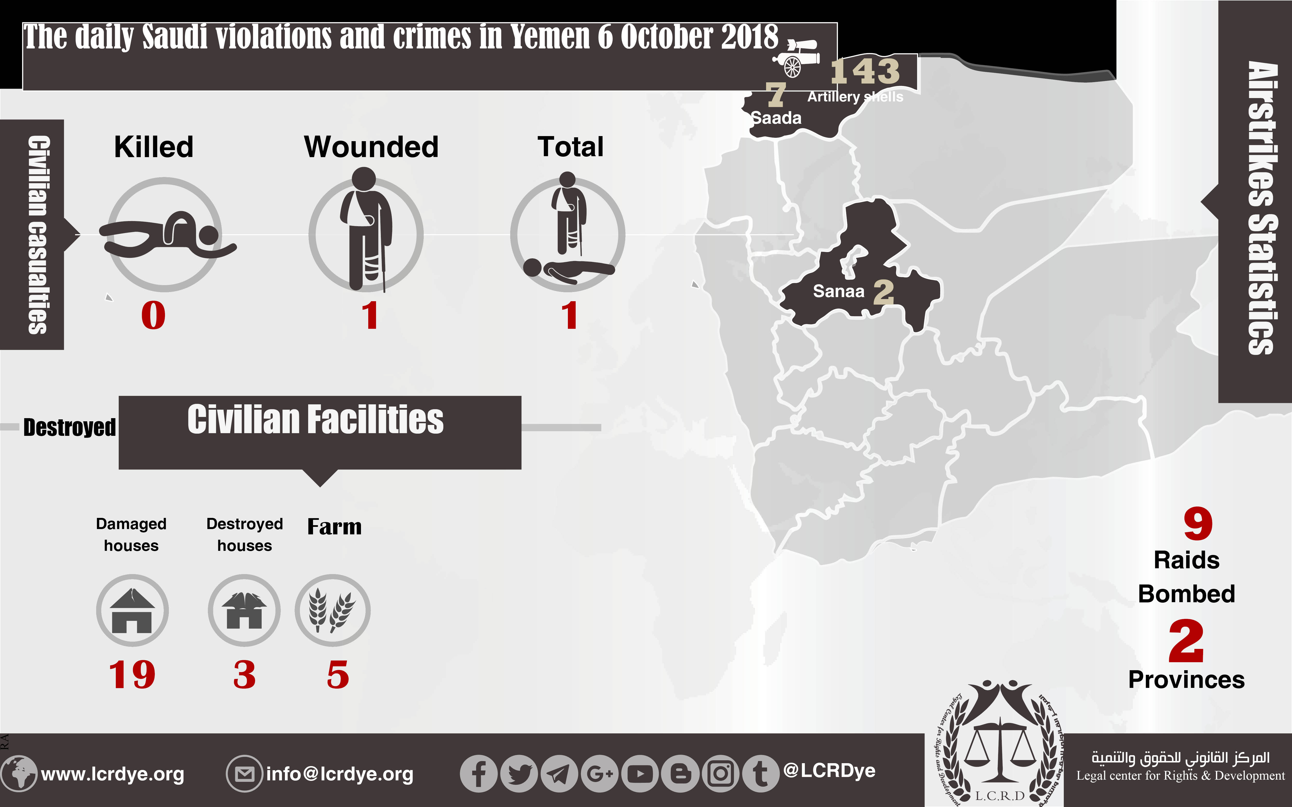 DAILY VIOLATION OBSERVATION REPORTS The daily report of the Saudi violations and crimes in Yemen 6 Oct 2018 Share For download: https://www.lcrdye.org/wp-content/uploads/2018/10/6-Oct-2018-2.pdf legal center for right and developmentSaudi coalition CrimesViolation war lawsYemen Share FacebookTwitterGoogle+ReddItWhatsAppPinterestEmail