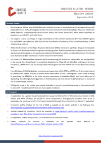• From 1 October, OCHA handed over monitoring and supervision of the RRM to UNFPA; the first meeting chaired by UNFPA will be held on Thursday 4 October at the UNFPA office in Sana’a. The Logistics Cluster is only in charge of assembling the RRM kits at the three common warehouses in Hodeidah (Bajil), Sana’a and Aden and of dispatching them to implementing partners in field locations; last mile delivery to beneficiaries is to be carried out by implementing partners.