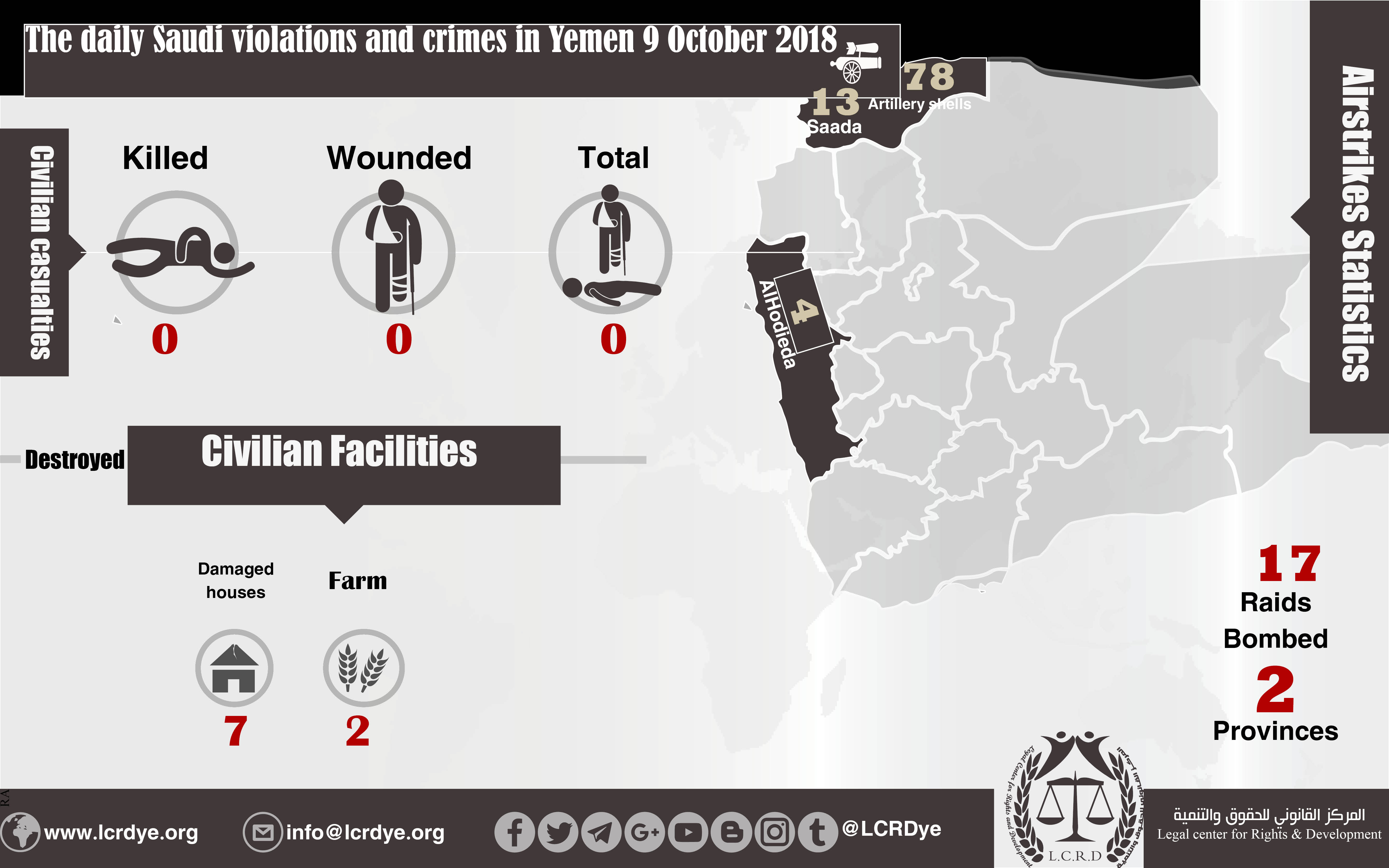 DAILY VIOLATION OBSERVATION REPORTS The daily report of the Saudi violations and crimes in Yemen 9 Oct 2018 Share For download: https://www.lcrdye.org/wp-content/uploads/2018/10/9-Oct-2018.pdf legal center for right and developmentSaudi coalition CrimesViolation war lawsYemen Share FacebookTwitterGoogle+ReddItWhatsAppPinterestEmail
