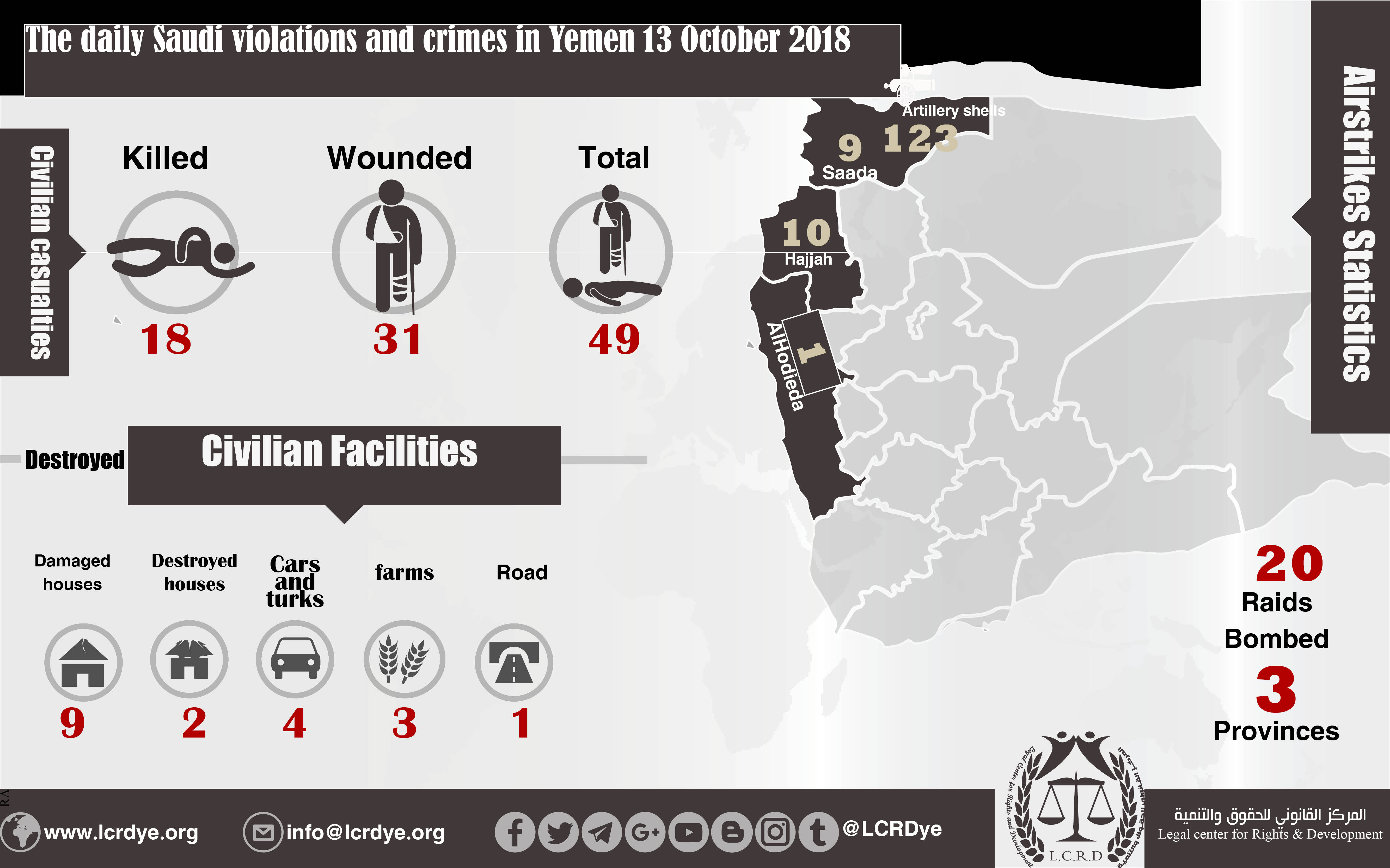 DAILY VIOLATION OBSERVATION REPORTS The daily report of the Saudi violations and crimes in Yemen 13 Oct 2018 Share For download: https://www.lcrdye.org/wp-content/uploads/2018/10/13-Oct-2018.pdf legal center for right and developmentSaudi coalition CrimesViolation war lawsYemen Share FacebookTwitterGoogle+ReddItWhatsAppPinterestEmail