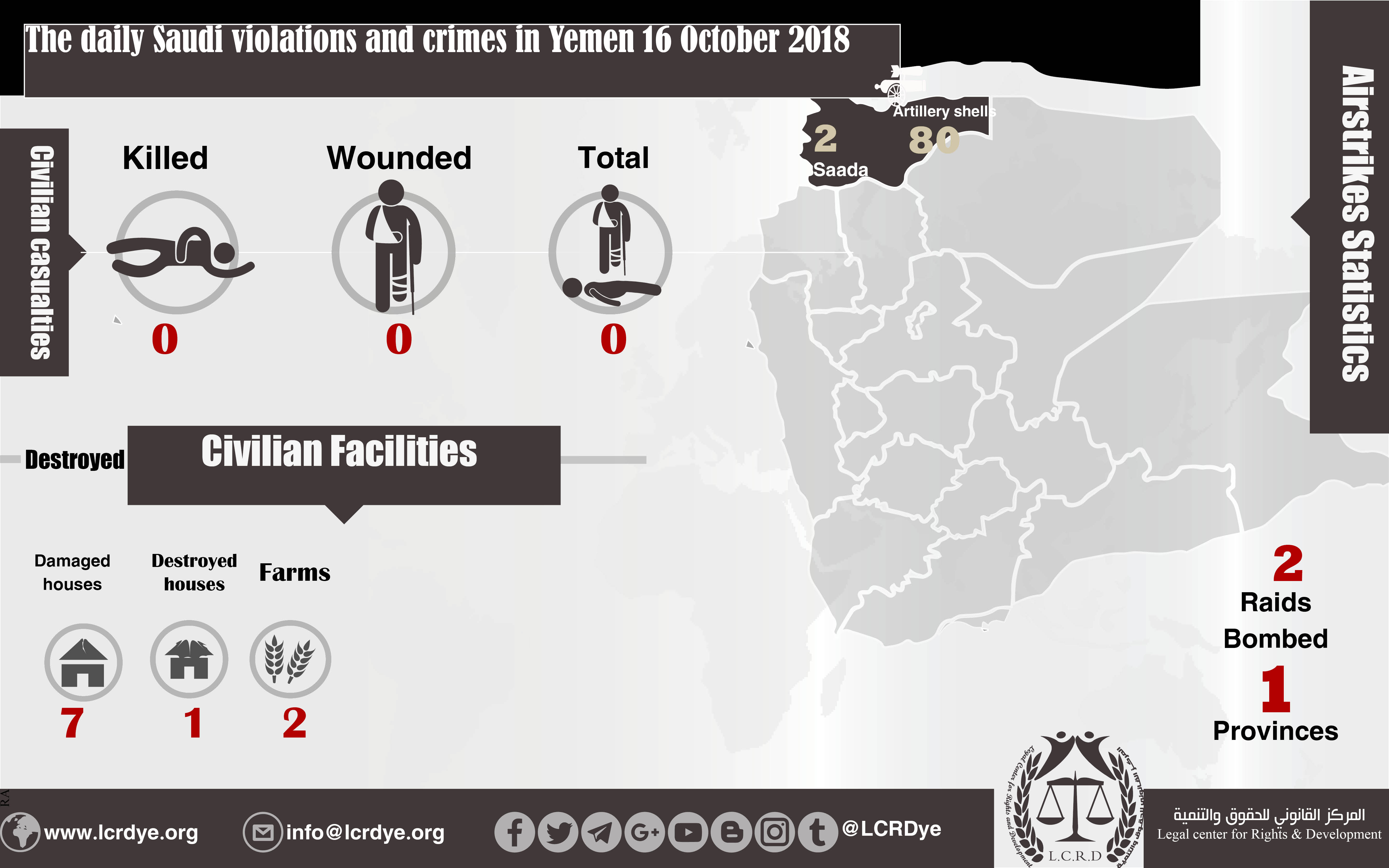 DAILY VIOLATION OBSERVATION REPORTS The daily report of the Saudi violations and crimes in Yemen 15 Oct 2018 Share For download: https://www.lcrdye.org/wp-content/uploads/2018/10/16-Oct-2018.pdf legal center for right and developmentSaudi coalition CrimesViolation war lawsYemen Share FacebookTwitterGoogle+ReddItWhatsAppPinterestEmail