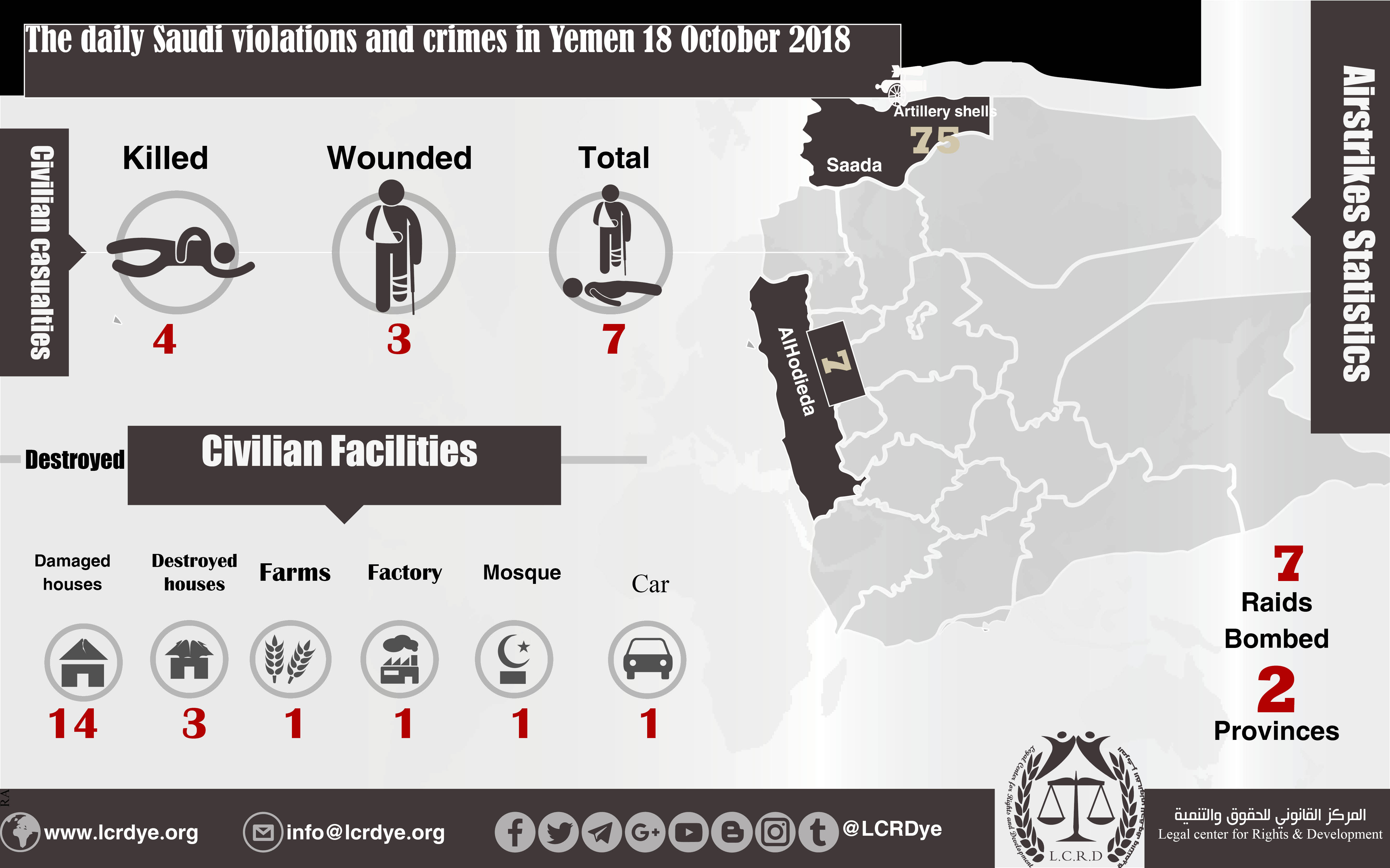 DAILY VIOLATION OBSERVATION REPORTS The daily report of the Saudi violations and crimes in Yemen 18 Oct 2018 Share For download: https://www.lcrdye.org/wp-content/uploads/2018/10/18-Oct-2018.pdf legal center for right and developmentSaudi coalition CrimesViolation war lawsYemen Share FacebookTwitterGoogle+ReddItWhatsAppPinterestEmail