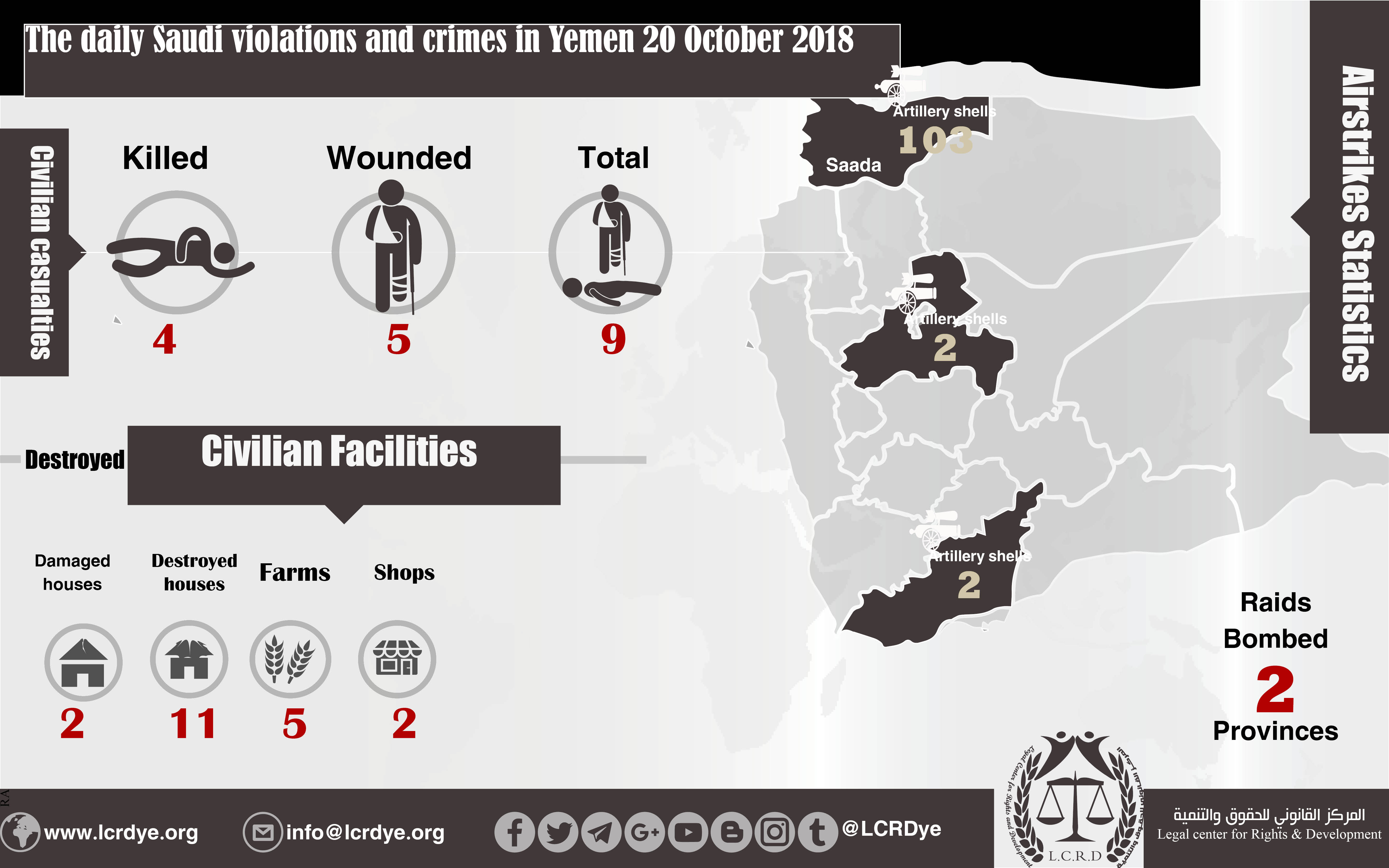DAILY VIOLATION OBSERVATION REPORTS The daily report of the Saudi violations and crimes in Yemen 20 Oct 2018 Share For download: https://www.lcrdye.org/wp-content/uploads/2018/10/20-Oct-2018.pdf legal center for right and developmentSaudi coalition CrimesViolation war lawsYemen Share FacebookTwitterGoogle+ReddItWhatsAppPinterestEmail