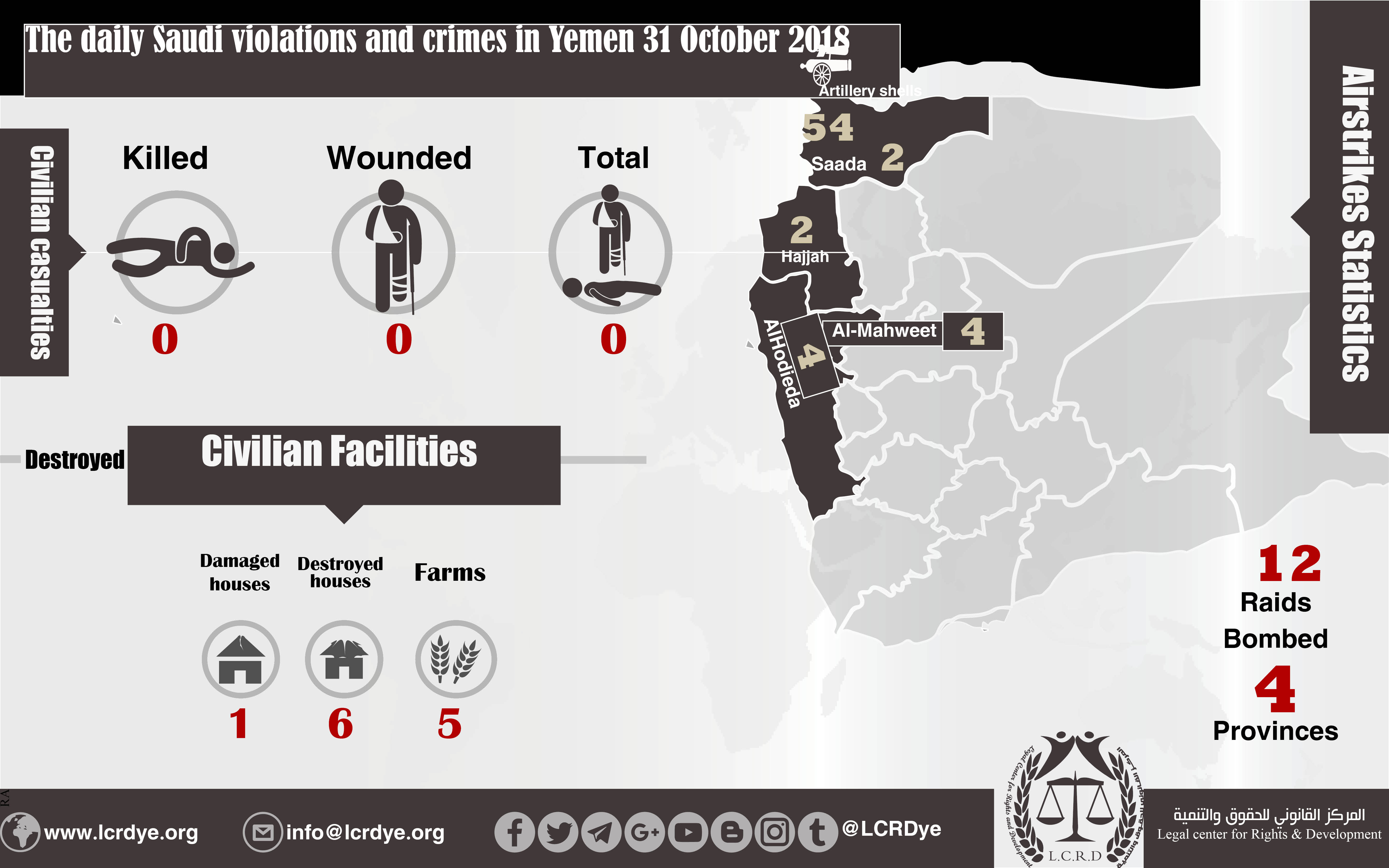 DAILY VIOLATION OBSERVATION REPORTS The daily report of the Saudi violations and crimes in Yemen 31 Oct 2018 Share For download: legal center for right and developmentSaudi coalition CrimesViolation war lawsYemen Share FacebookTwitterGoogle+ReddItWhatsAppPinterestEmail